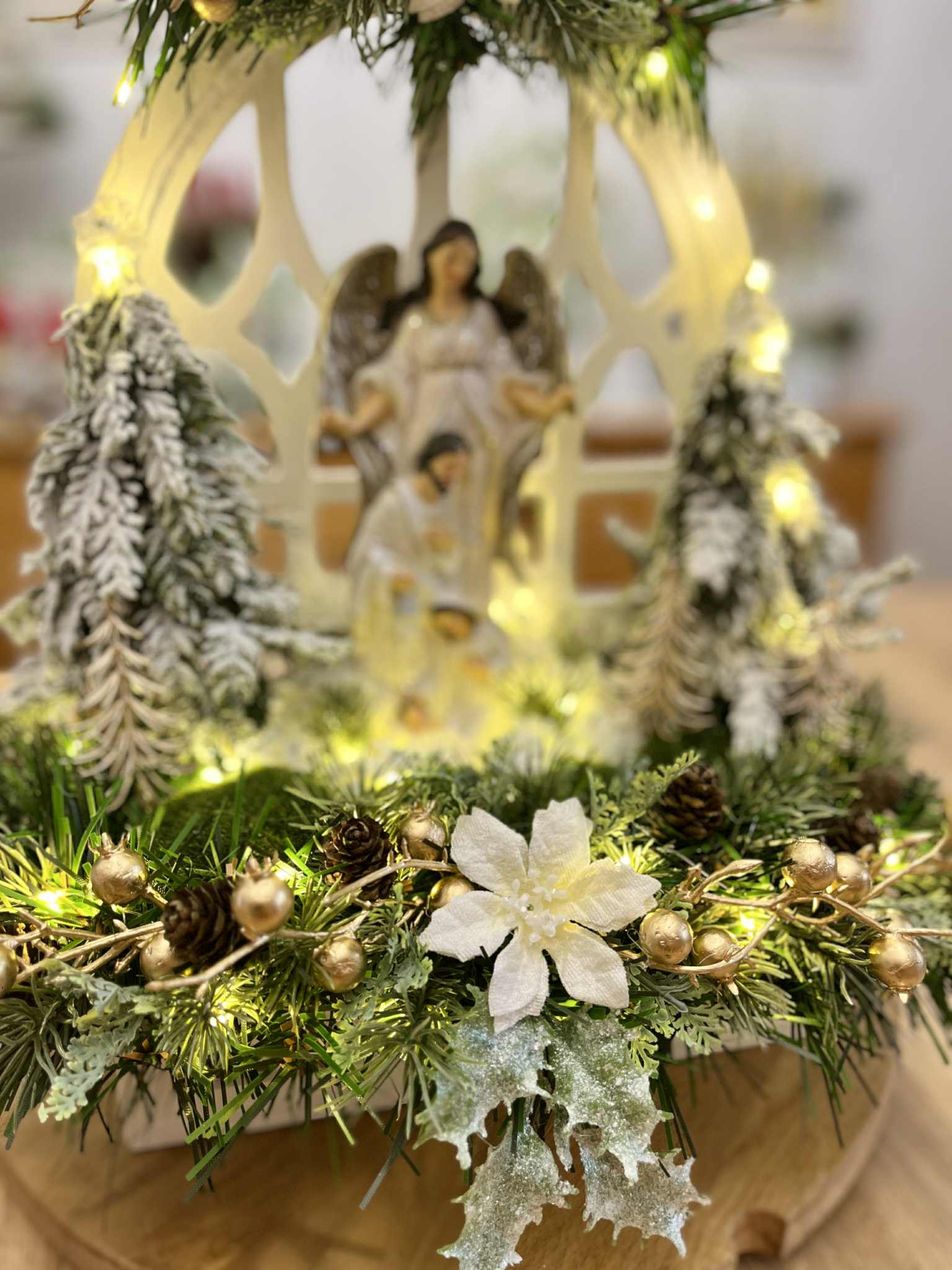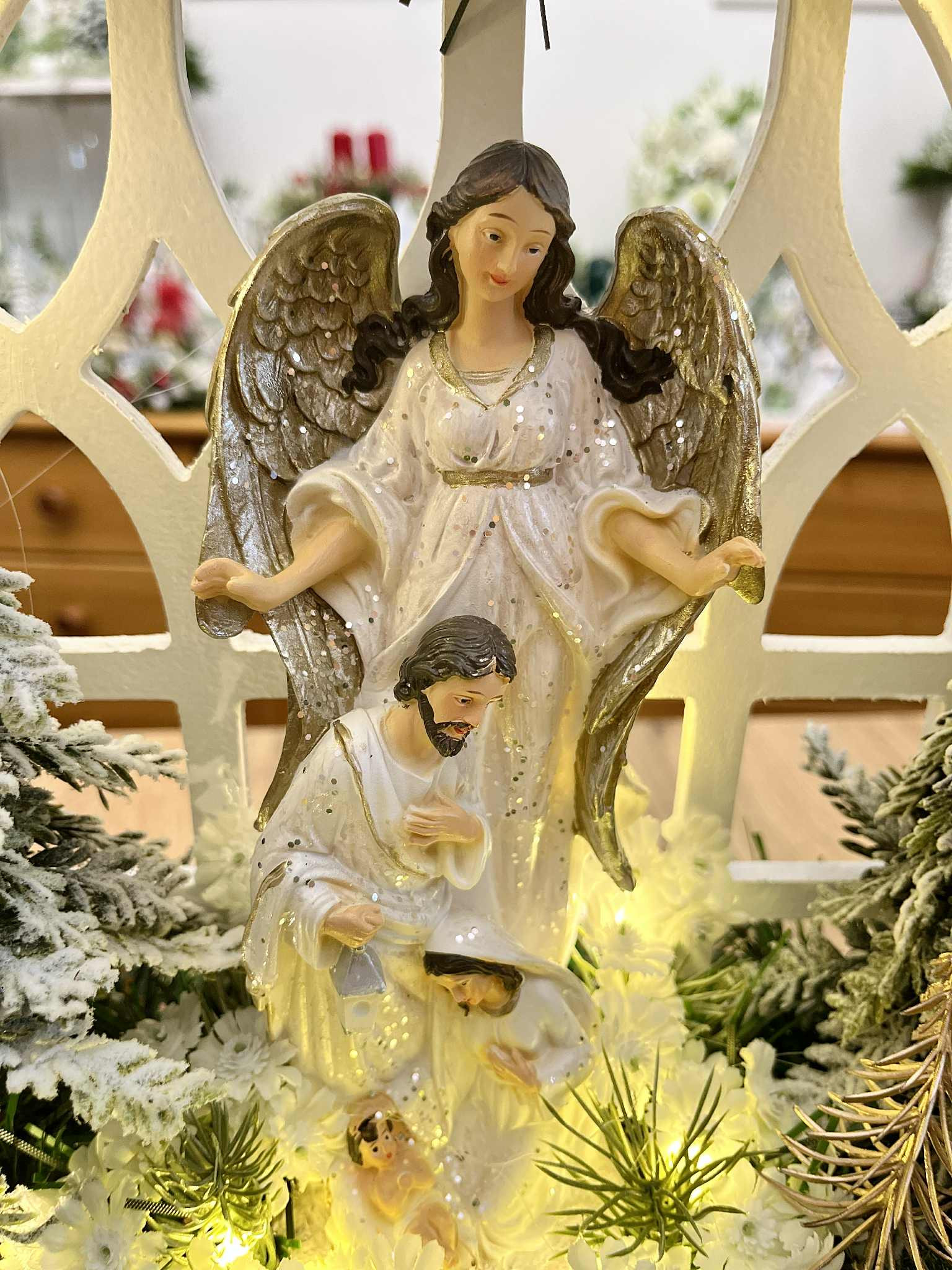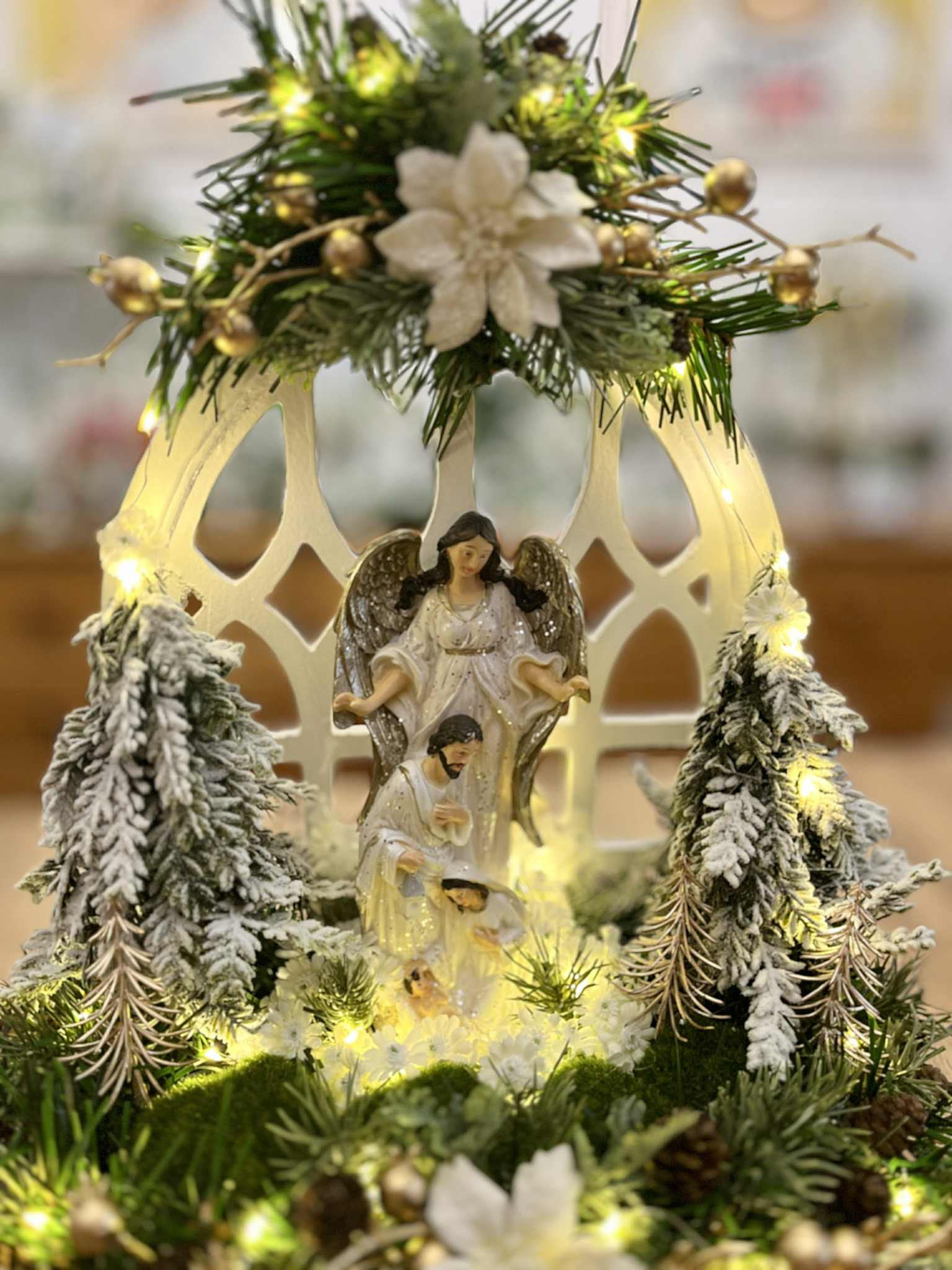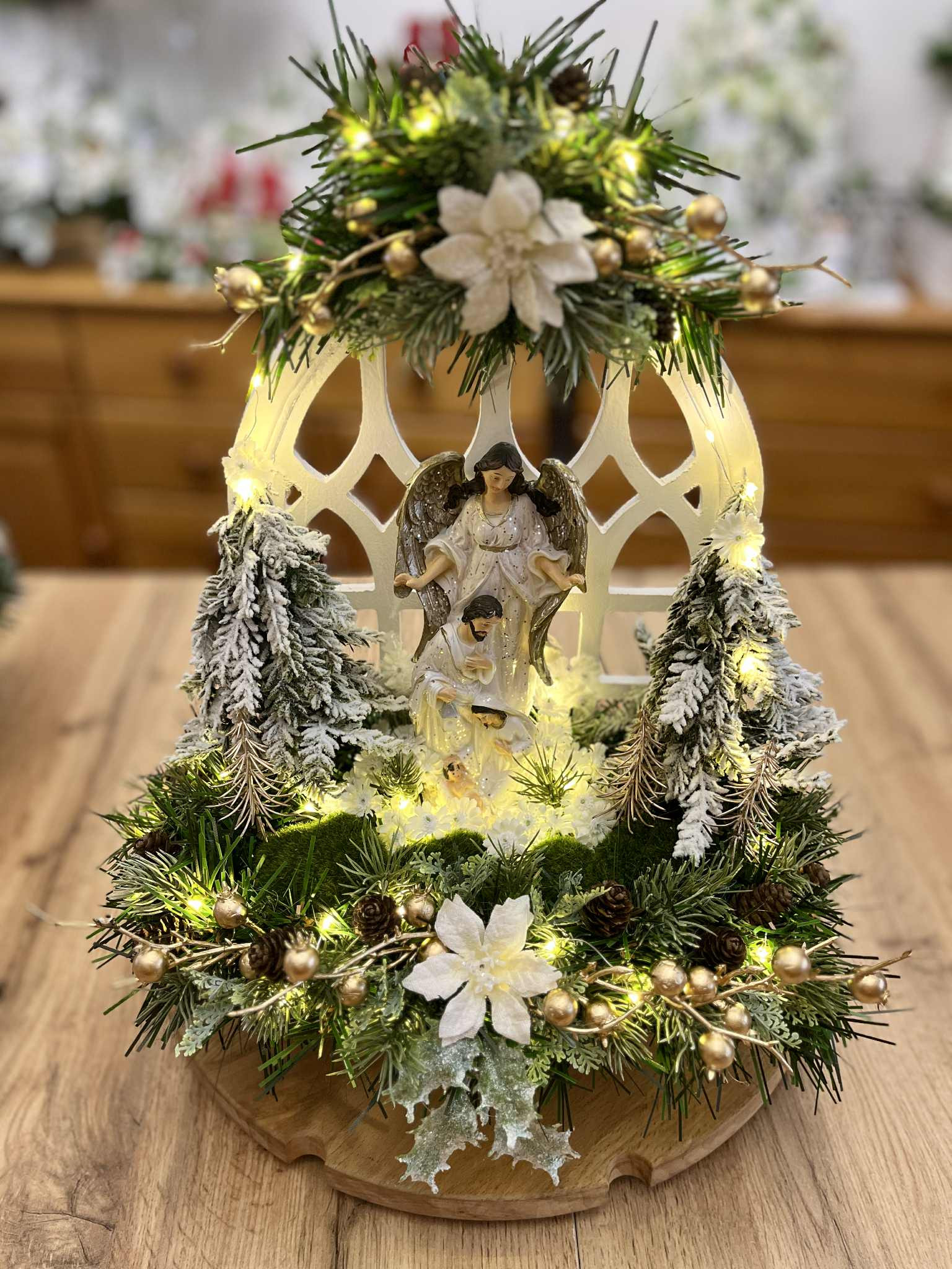 Betlehem v bielej farbe so strieborným ligotom v bielom drevenom okne, bohato zdobený zasneženou zeleňou a stromčekmi, vpredu sú machové kamene. Celý Betlehem je podsvietený svetielkami na baterky, ktoré sú súčasťou dekorácie.
