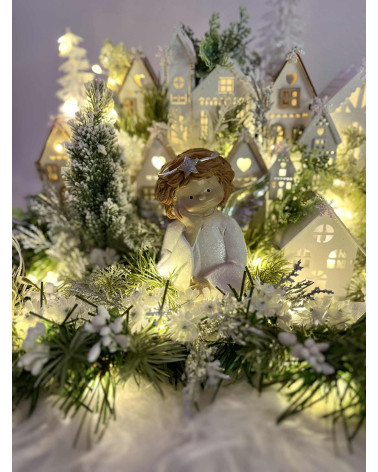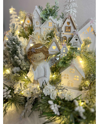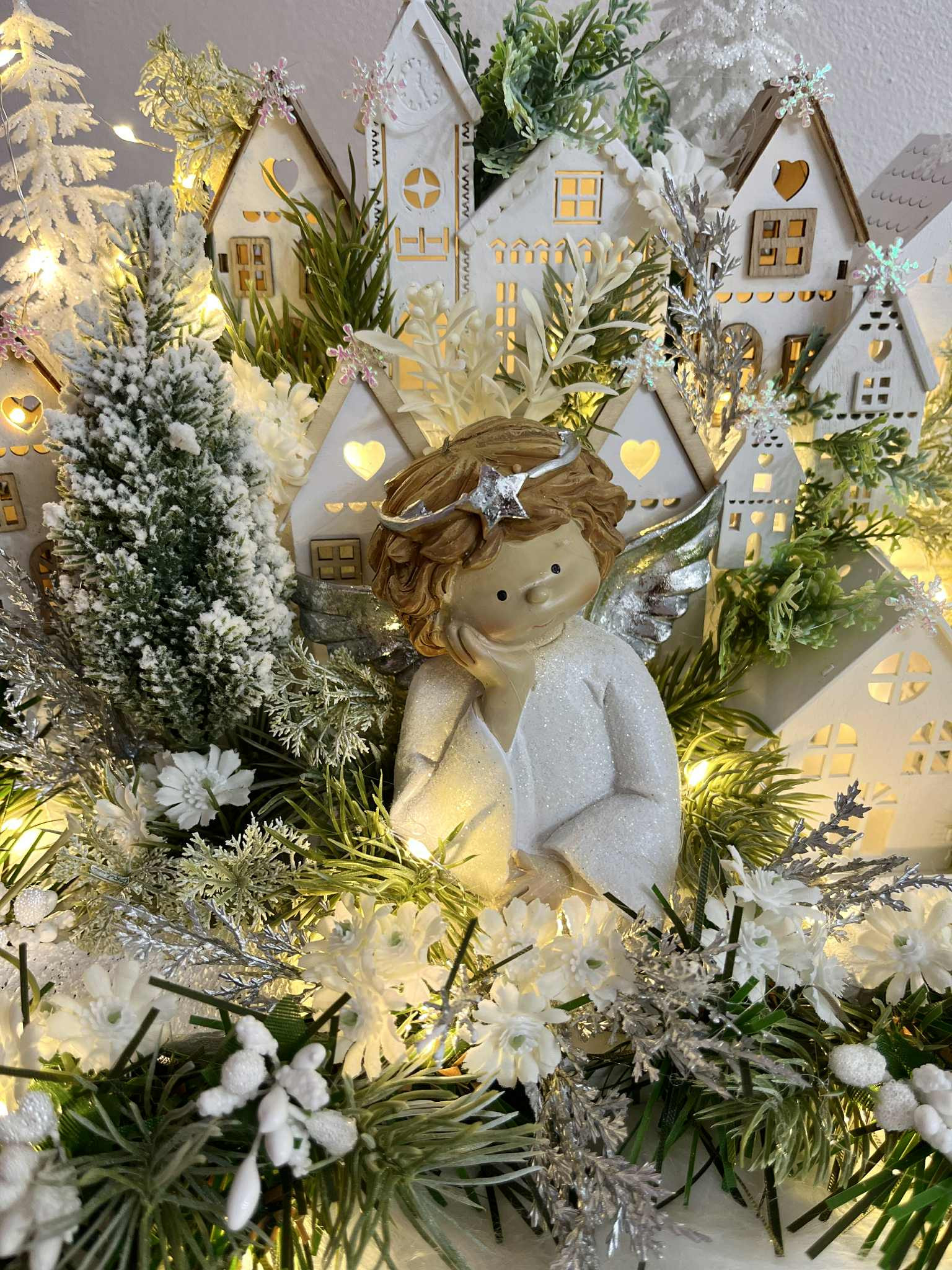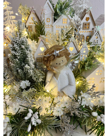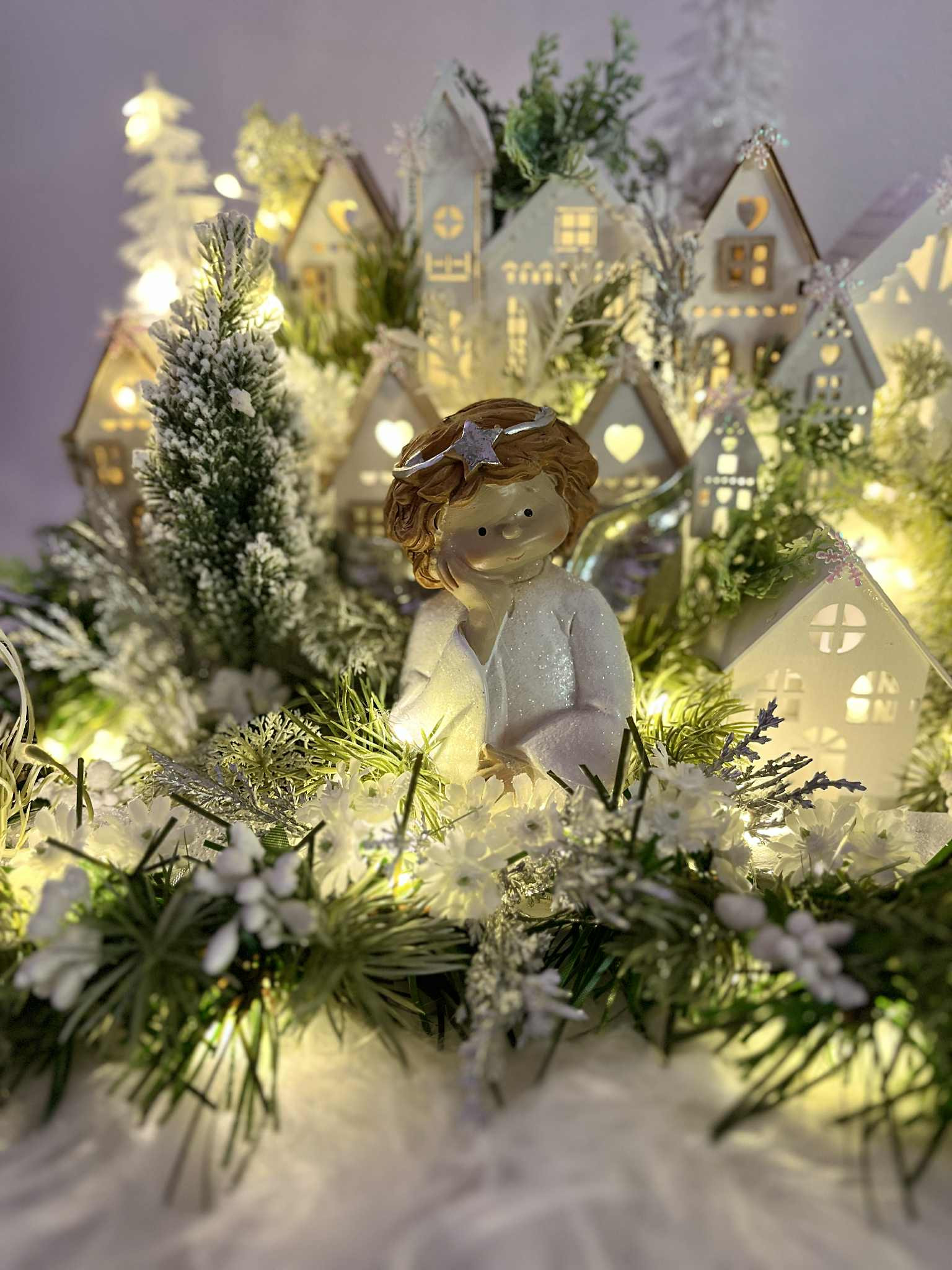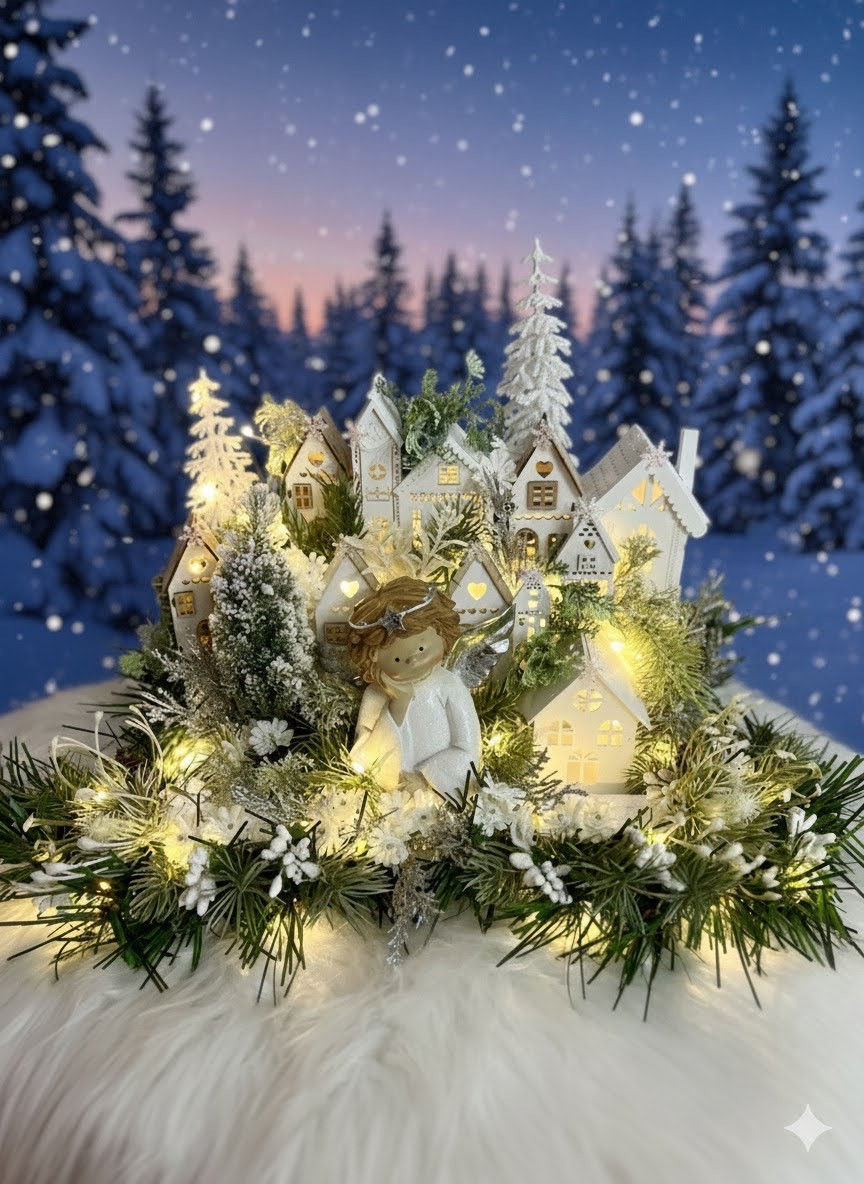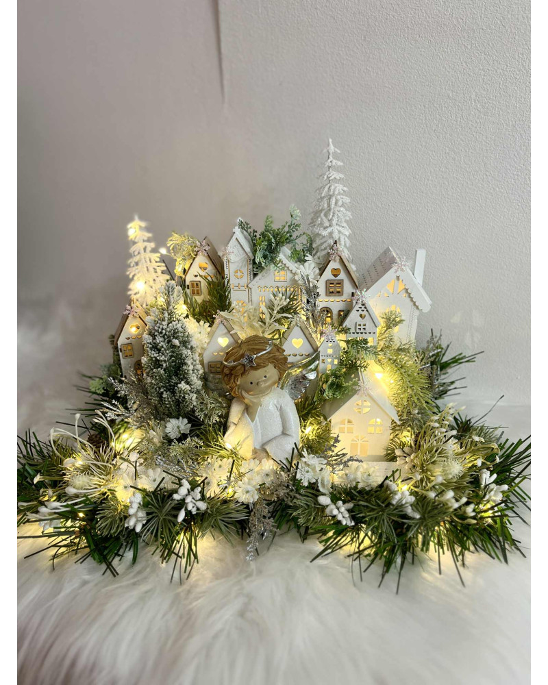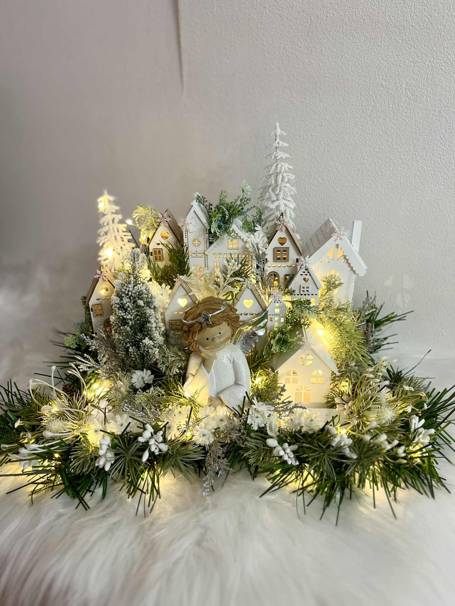 Zimná dedinka s bielym anjelikom, s drevenými domčekmi, zdobená zamrznutou a zasneženou zeleňou. Dedinka je podsvietená svetielkami na baterky, ktoré sú súčasťou dekorácie.