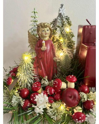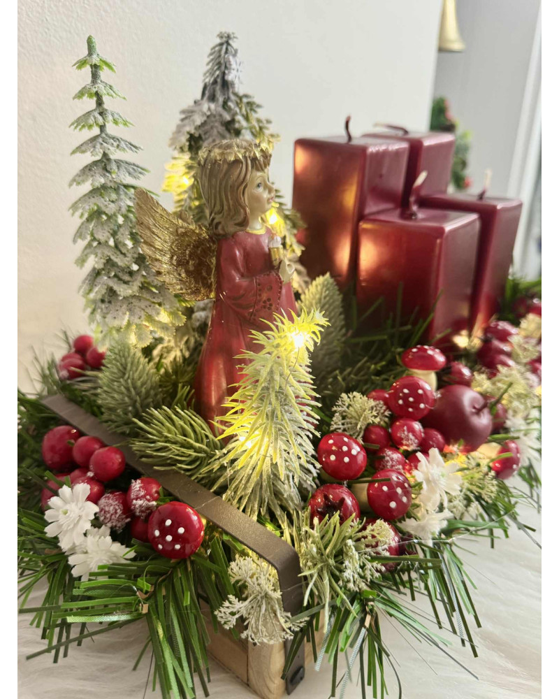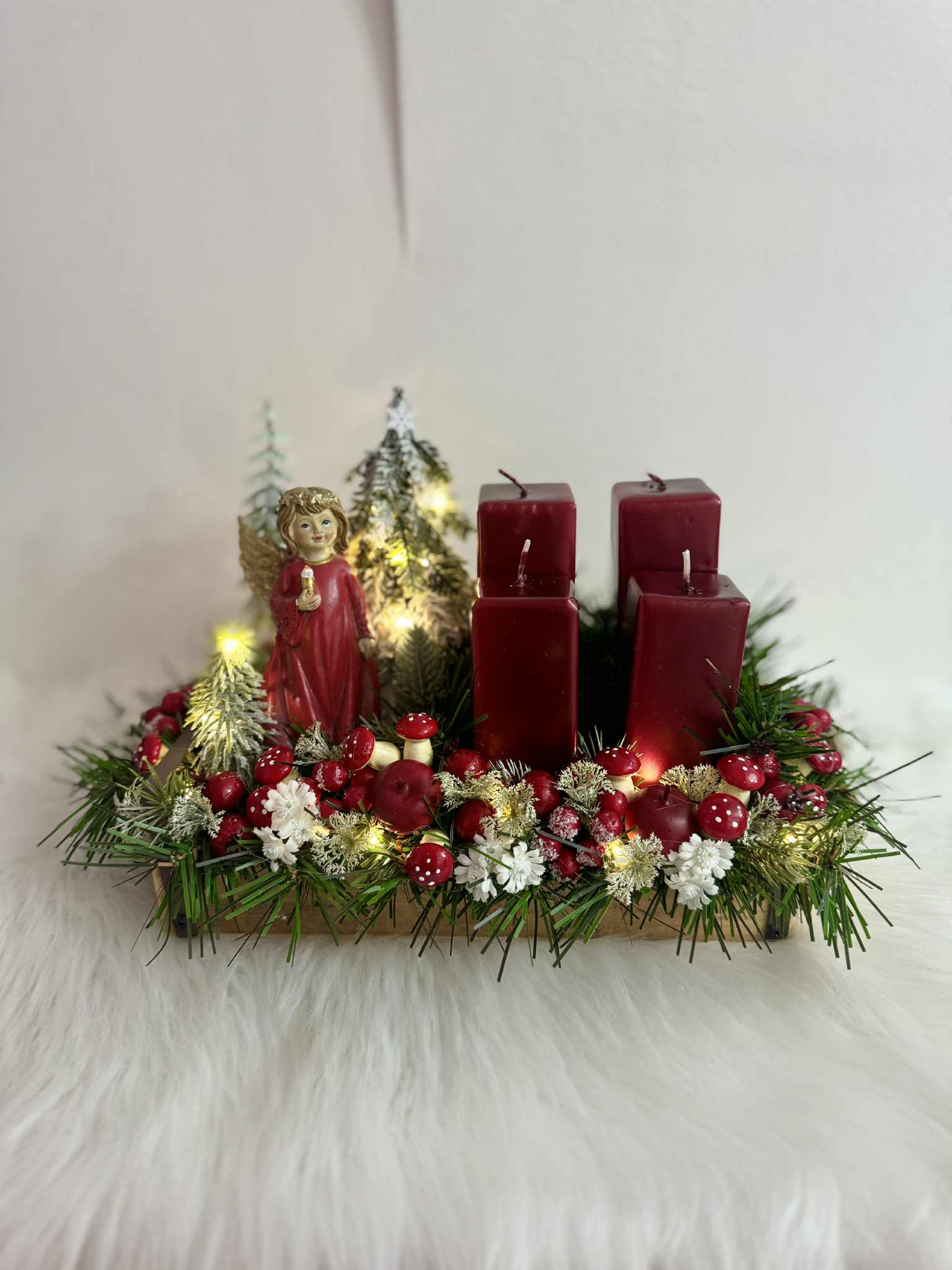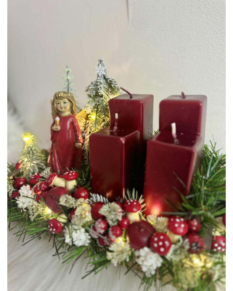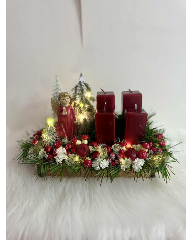 Adventný veniec v červeno vínových farbách s anjelikom, ktorý si drží sviečku, je robený do drevenej nádoby plnej zamrznutej čečiny a primrznutých bobuľovín. Súčasťou svietnika sú hranaté sviečky na kovových bodcoch. Celý svietnik je podsvietený svetielkami na baterky, ktoré sú súčasťou dekorácie.