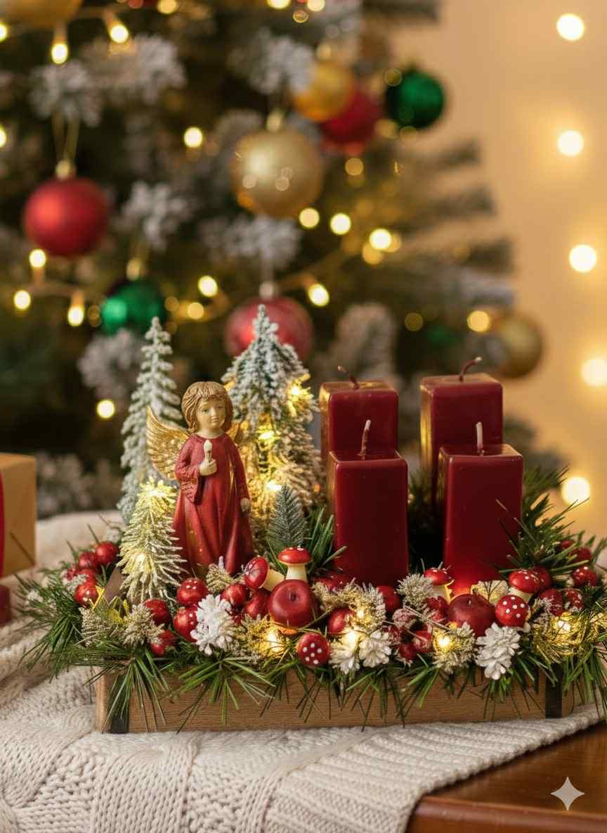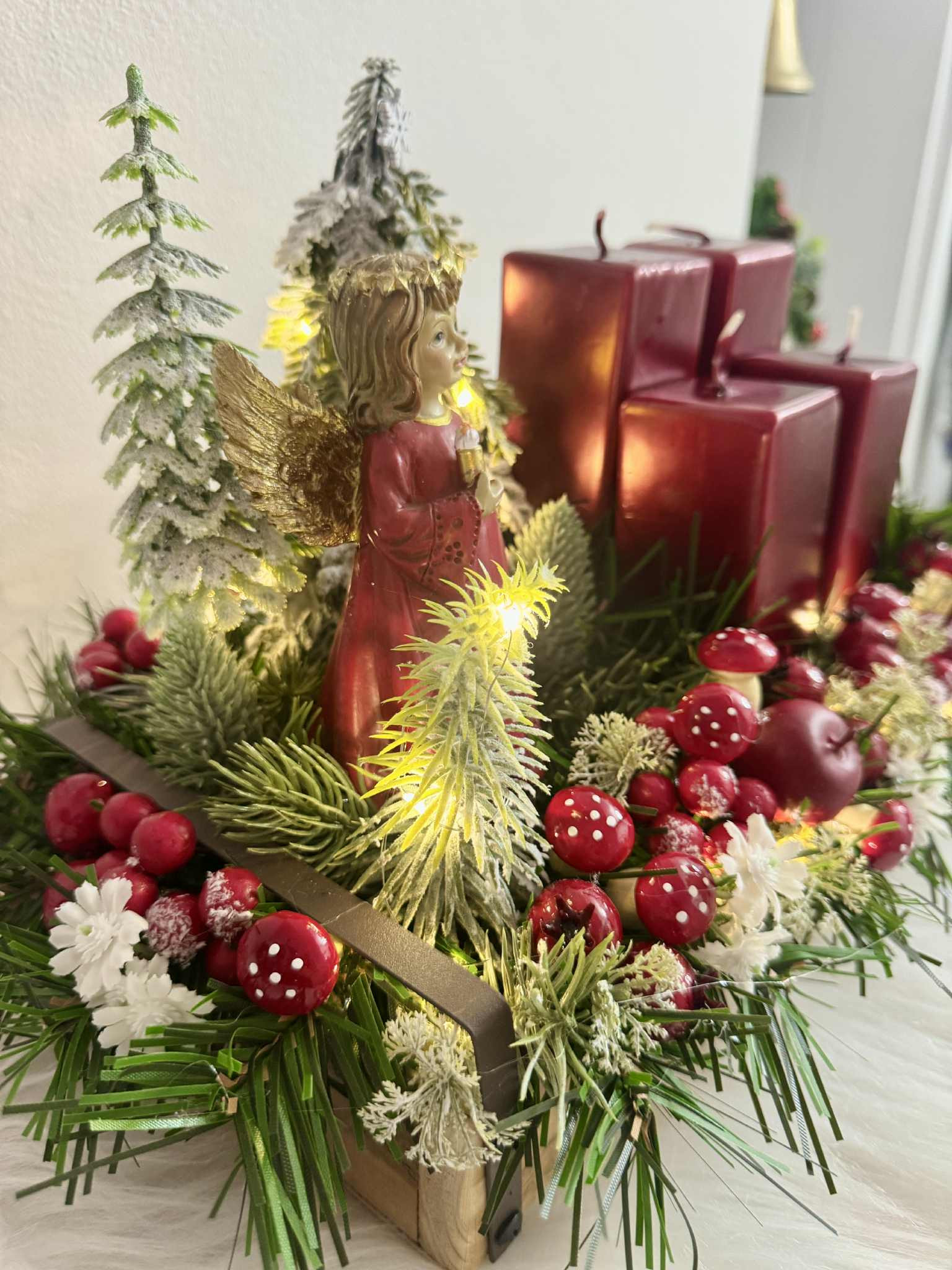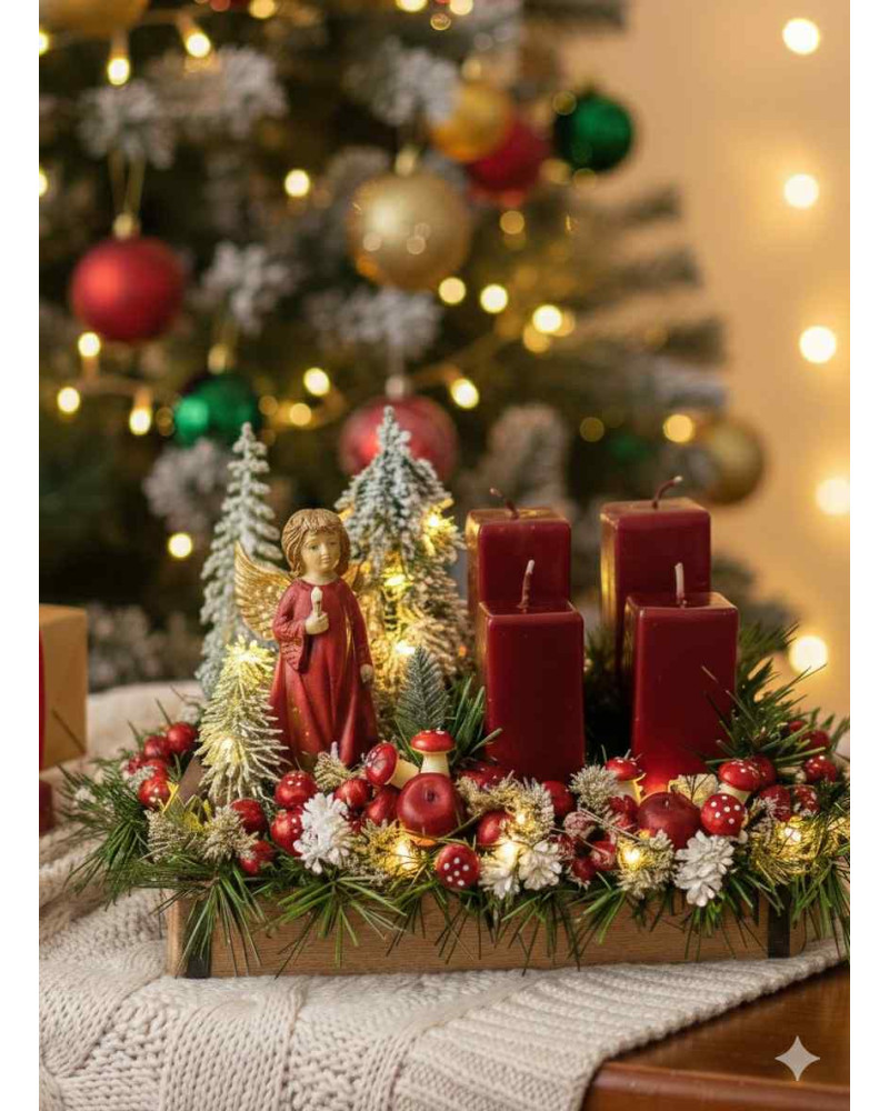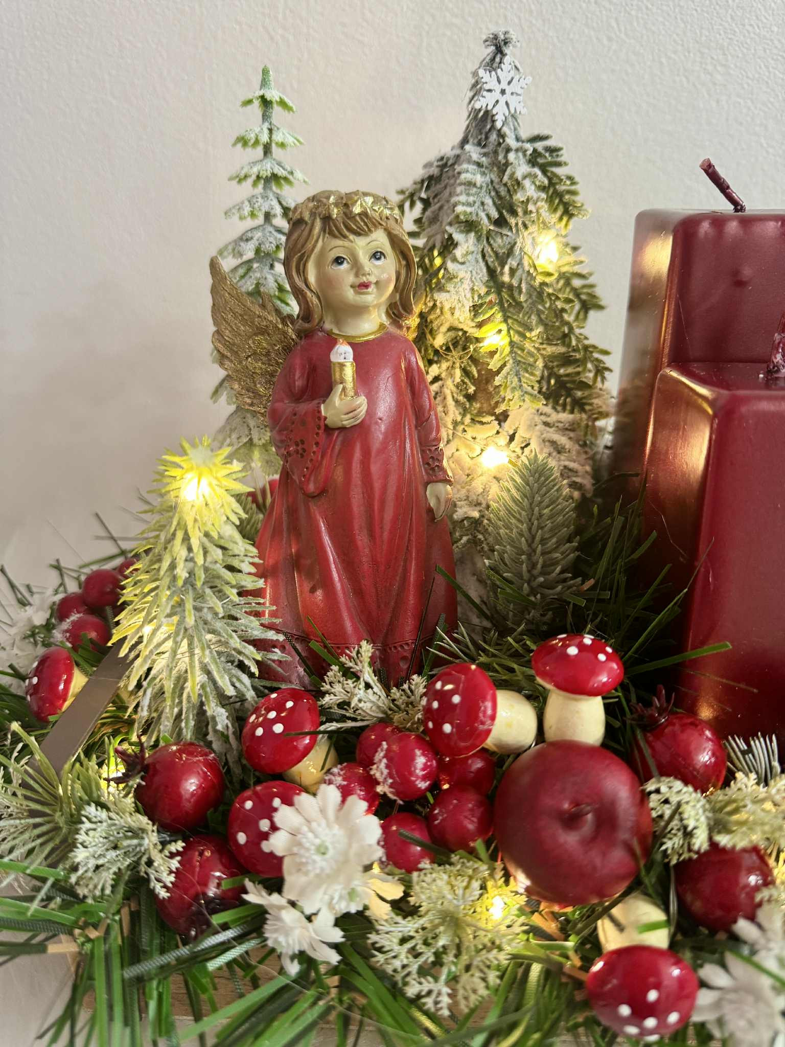 Adventný veniec v červeno vínových farbách s anjelikom, ktorý si drží sviečku, je robený do drevenej nádoby plnej zamrznutej čečiny a primrznutých bobuľovín. Súčasťou svietnika sú hranaté sviečky na kovových bodcoch. Celý svietnik je podsvietený svetielkami na baterky, ktoré sú súčasťou dekorácie.