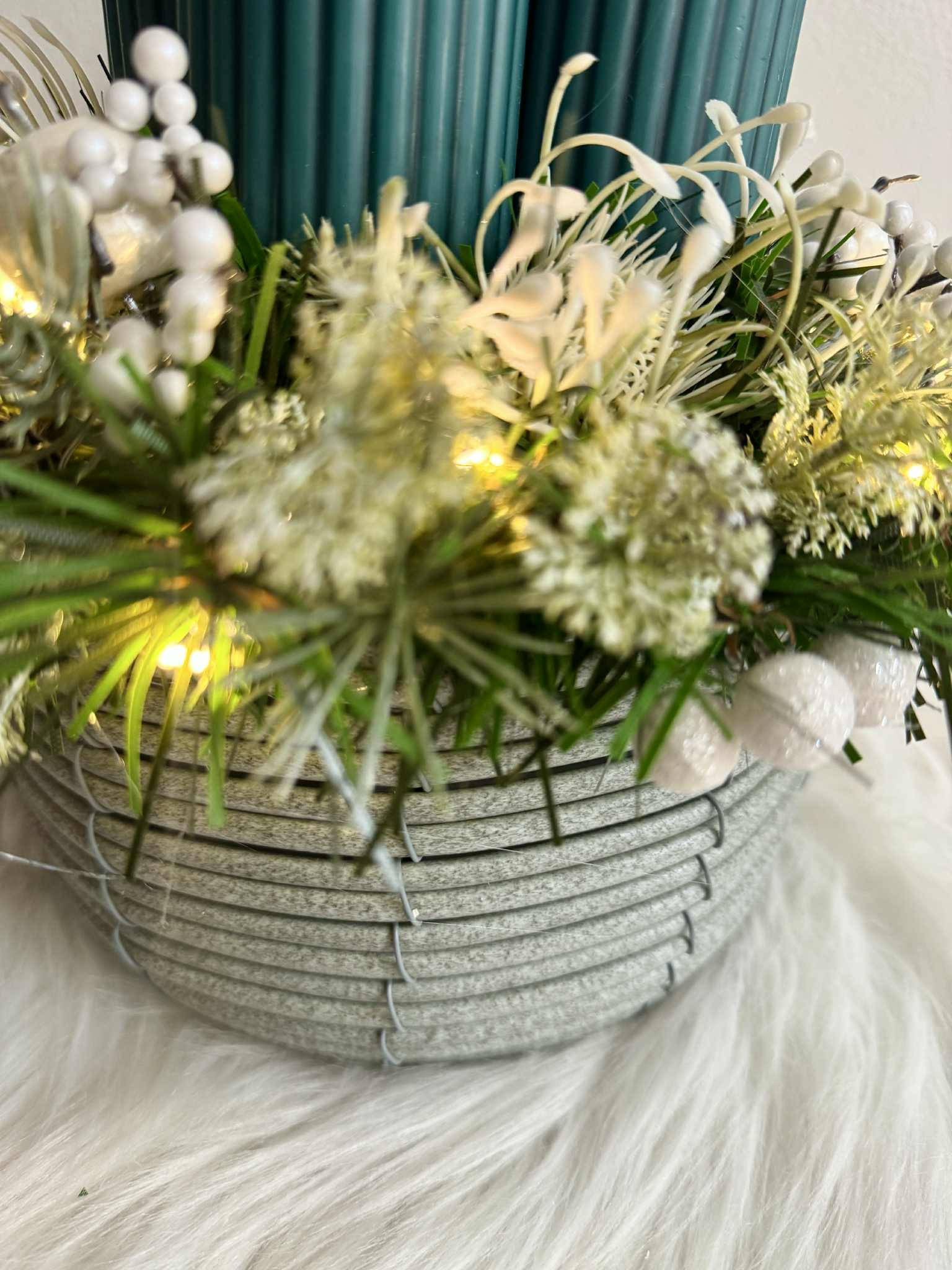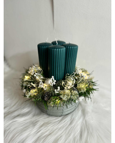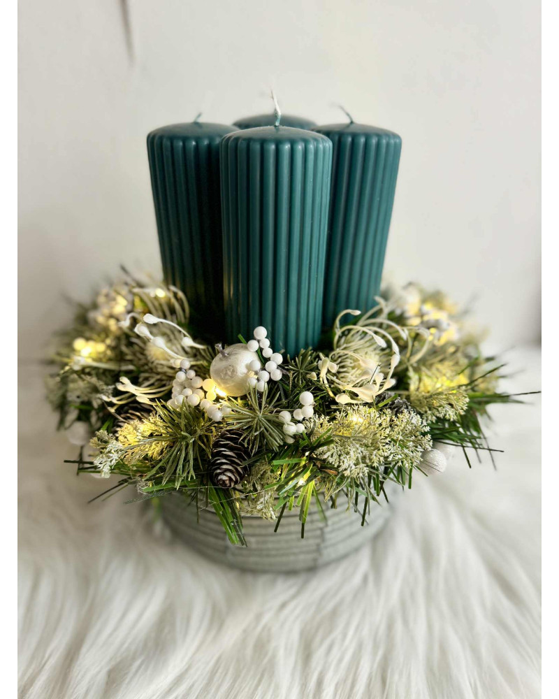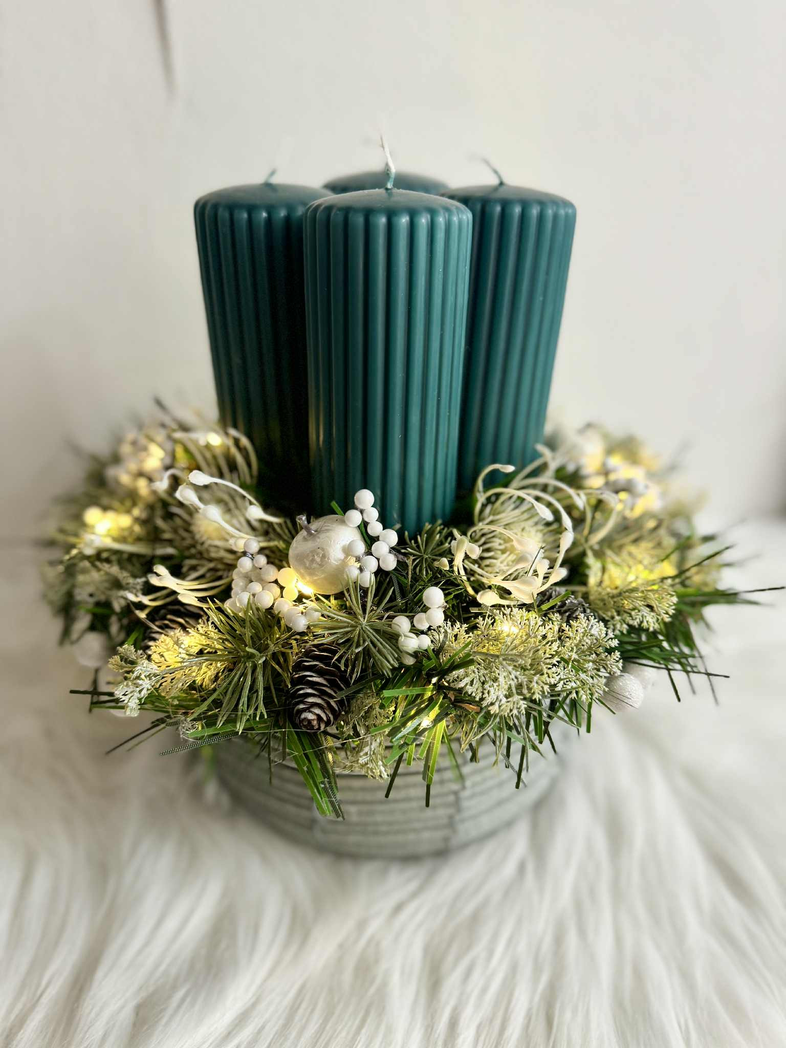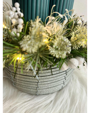 Adventný veniec v nádobke z umelého ratanu, dozdobený s čečinkou, trávami a bobuľkami. Sviečky sú na kovových bodcoch a sú súčasťou dekorácie. Celý svietnik je podsvietený svetielkami na baterky, ktoré sú súčasťou dekorácie.