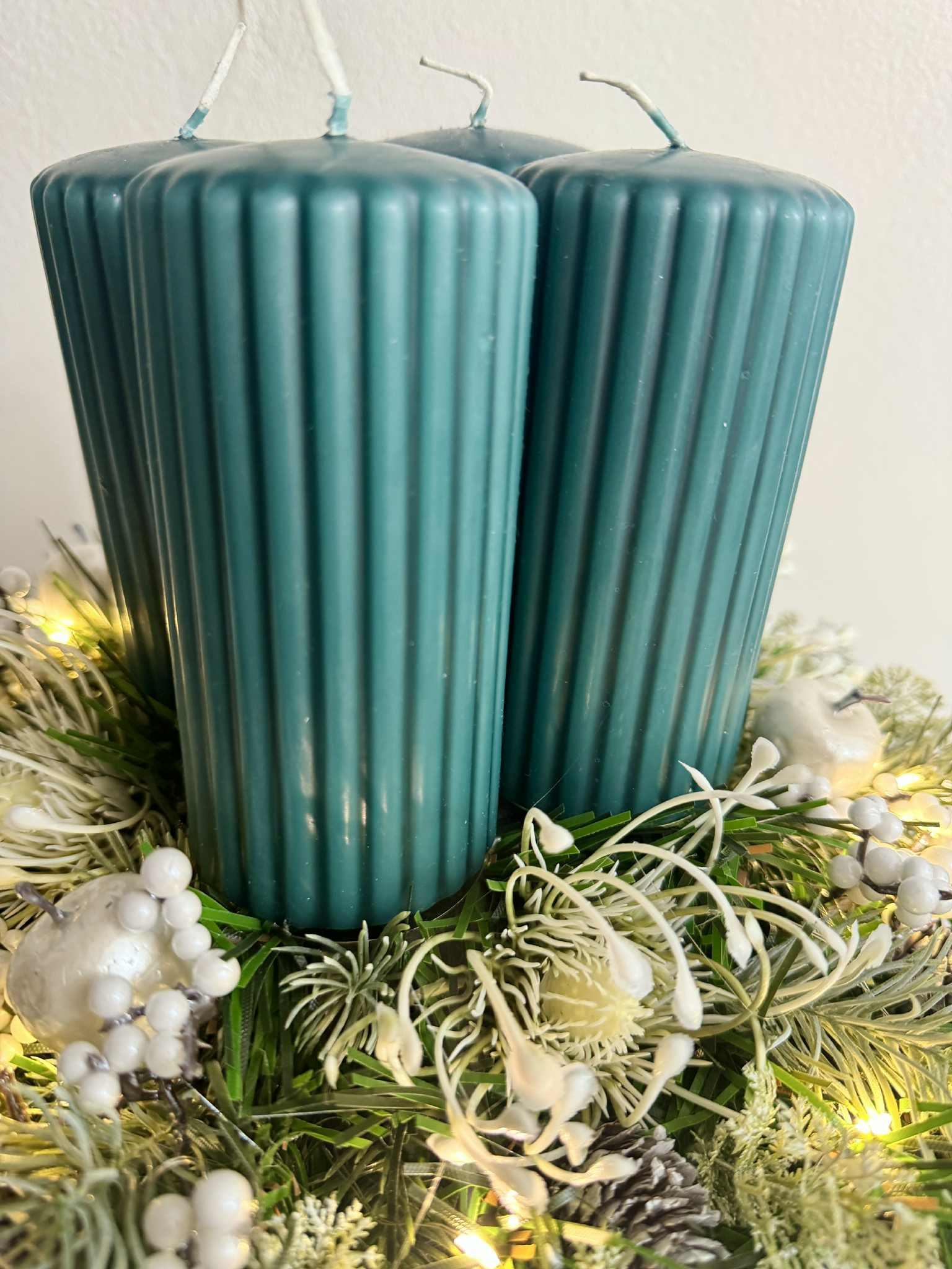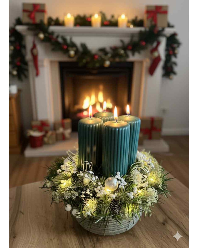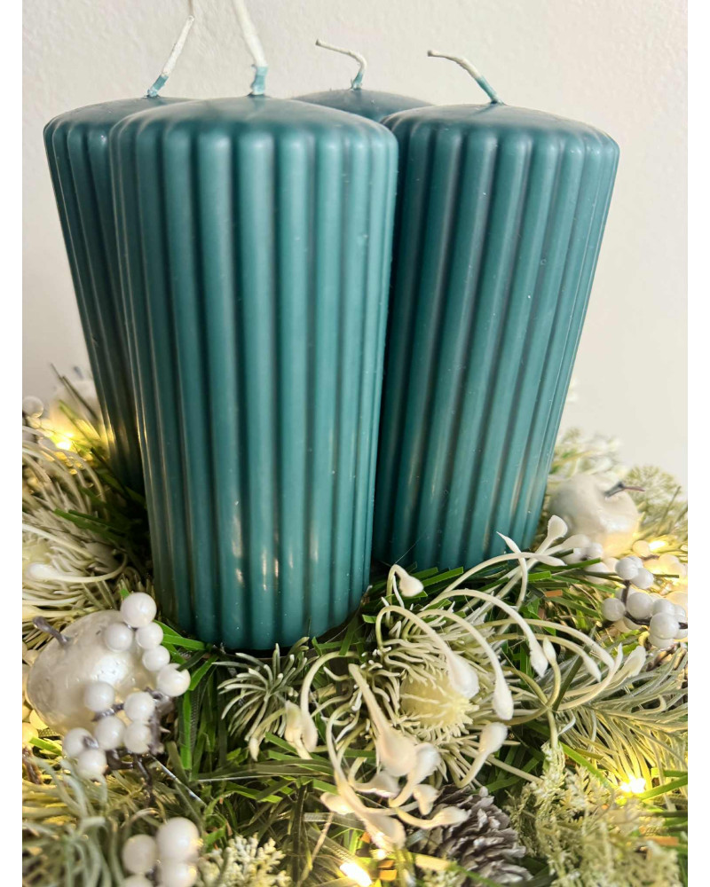 Adventný veniec v nádobke z umelého ratanu, dozdobený s čečinkou, trávami a bobuľkami. Sviečky sú na kovových bodcoch a sú súčasťou dekorácie. Celý svietnik je podsvietený svetielkami na baterky, ktoré sú súčasťou dekorácie.