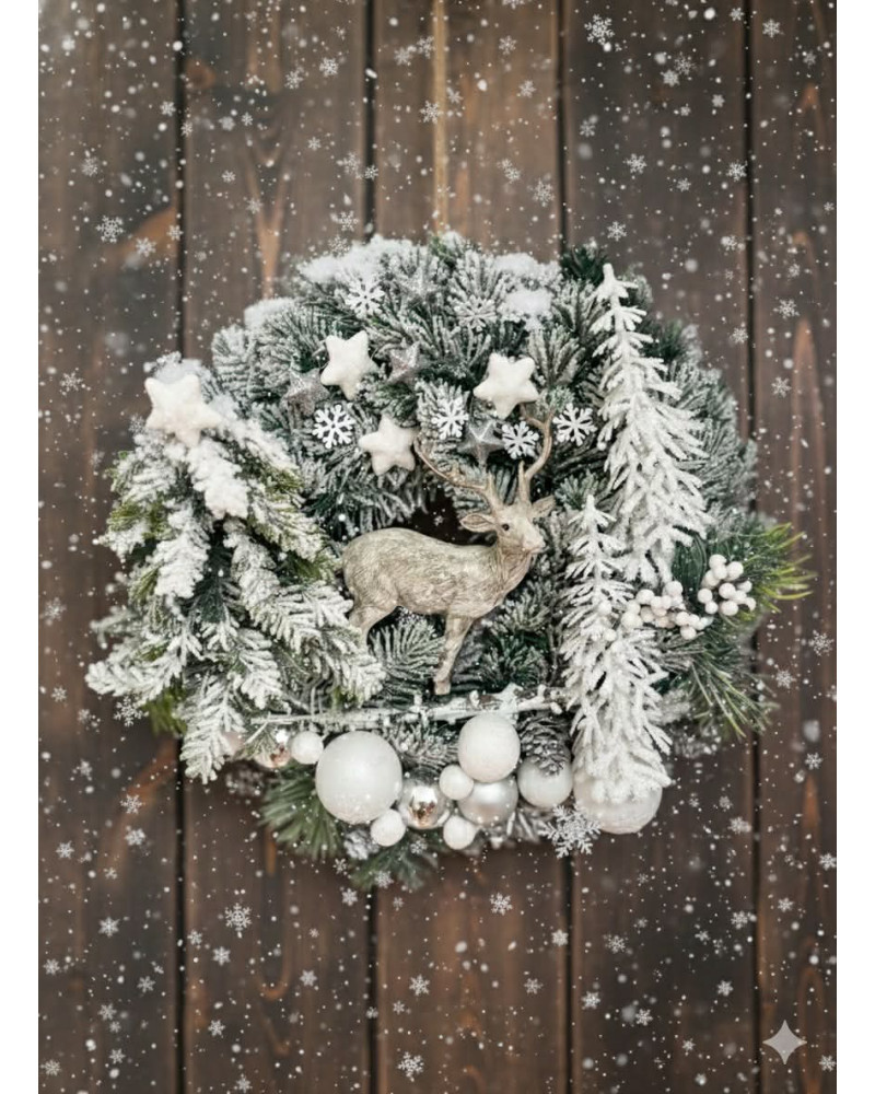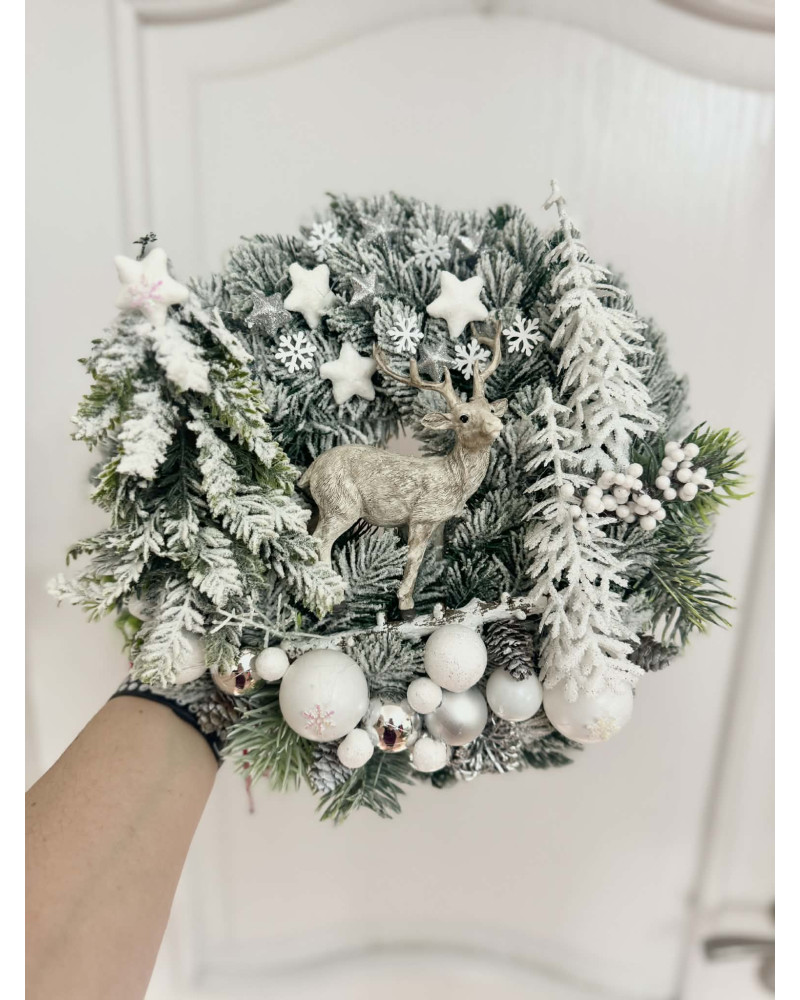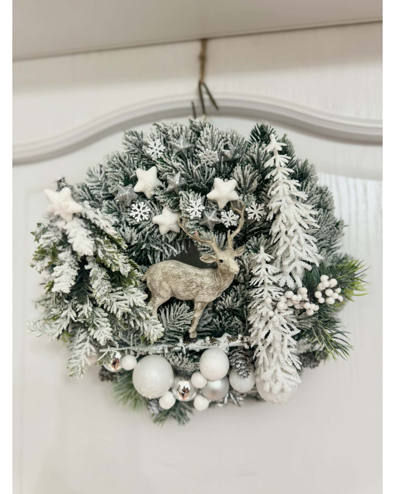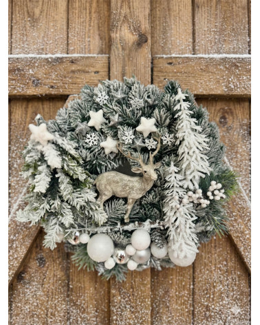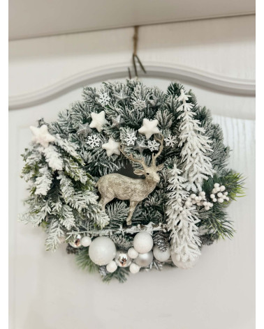 Zasnežený venček s jeleňom v bielom, s bielymi stromčekmi, aktuálny po celú zimu.