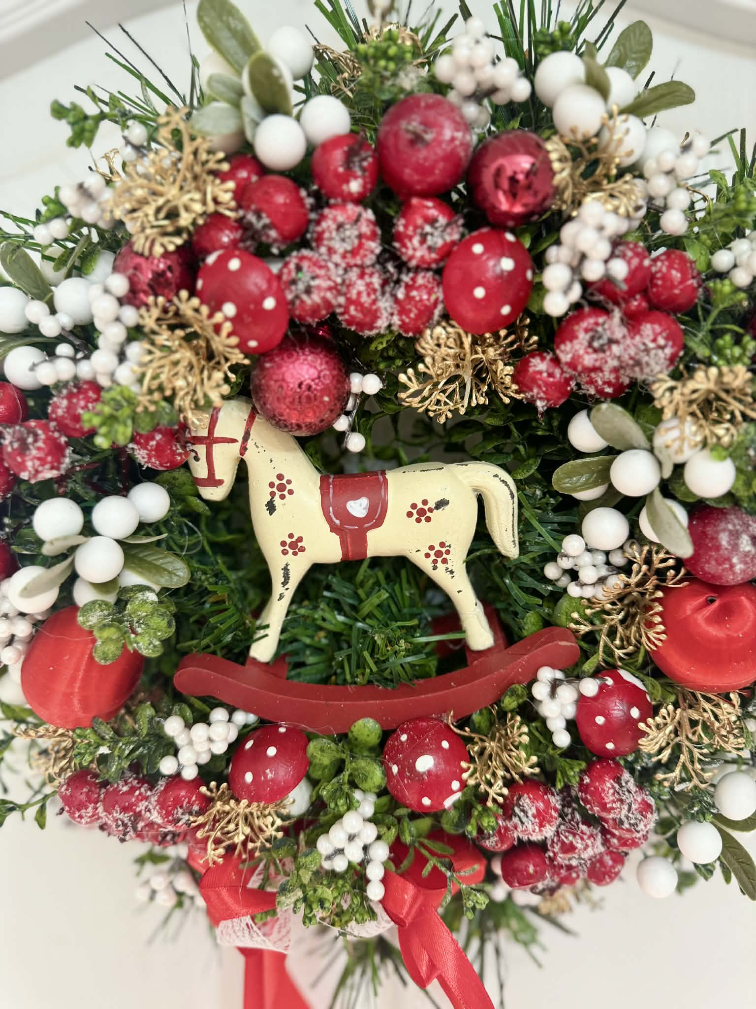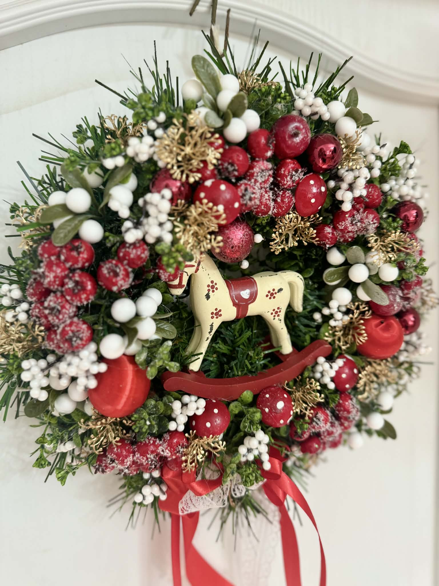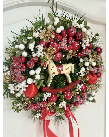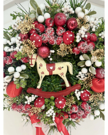 Čečinový veniec s bielo červeným zamrznutým zdobením, s červenou mašľou, s dreveným koníkom maslovej farby.