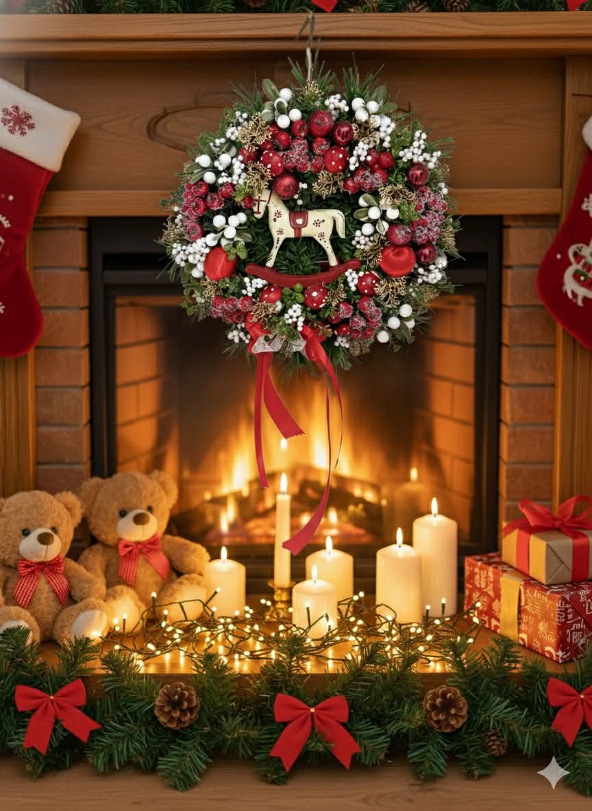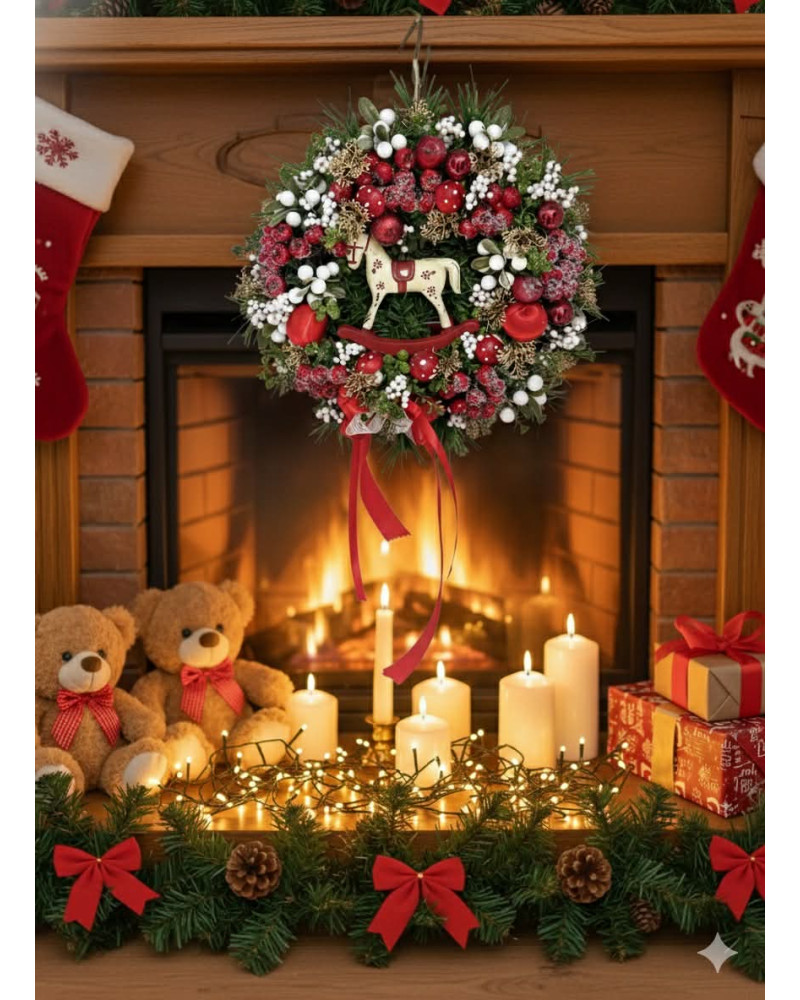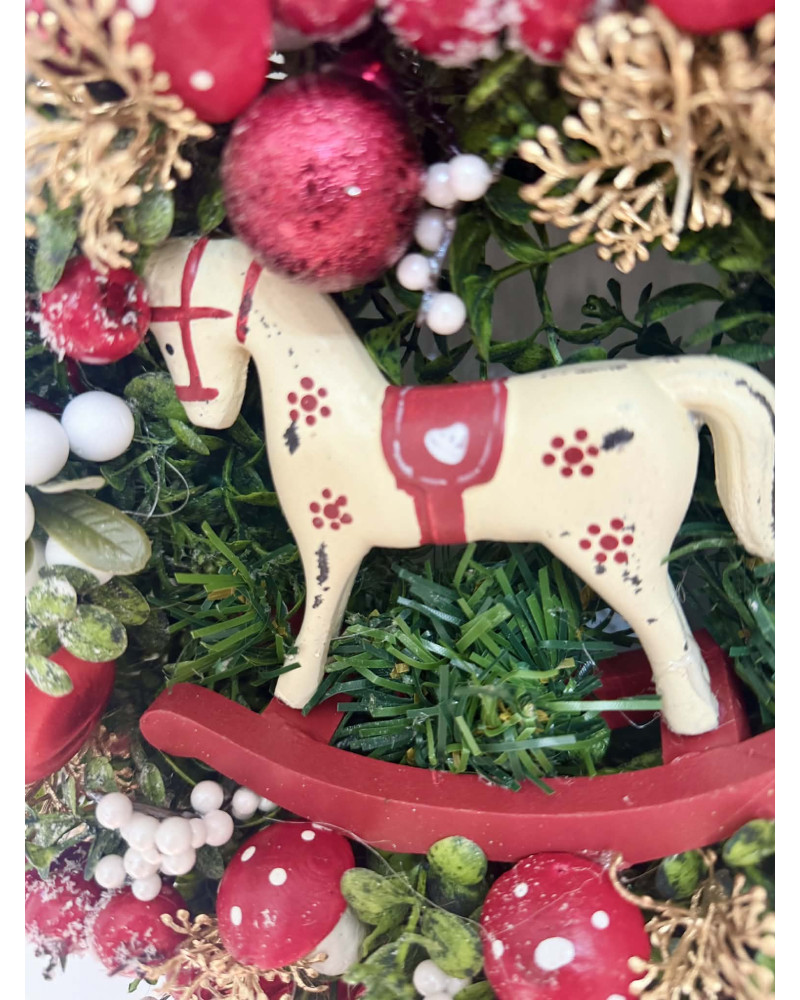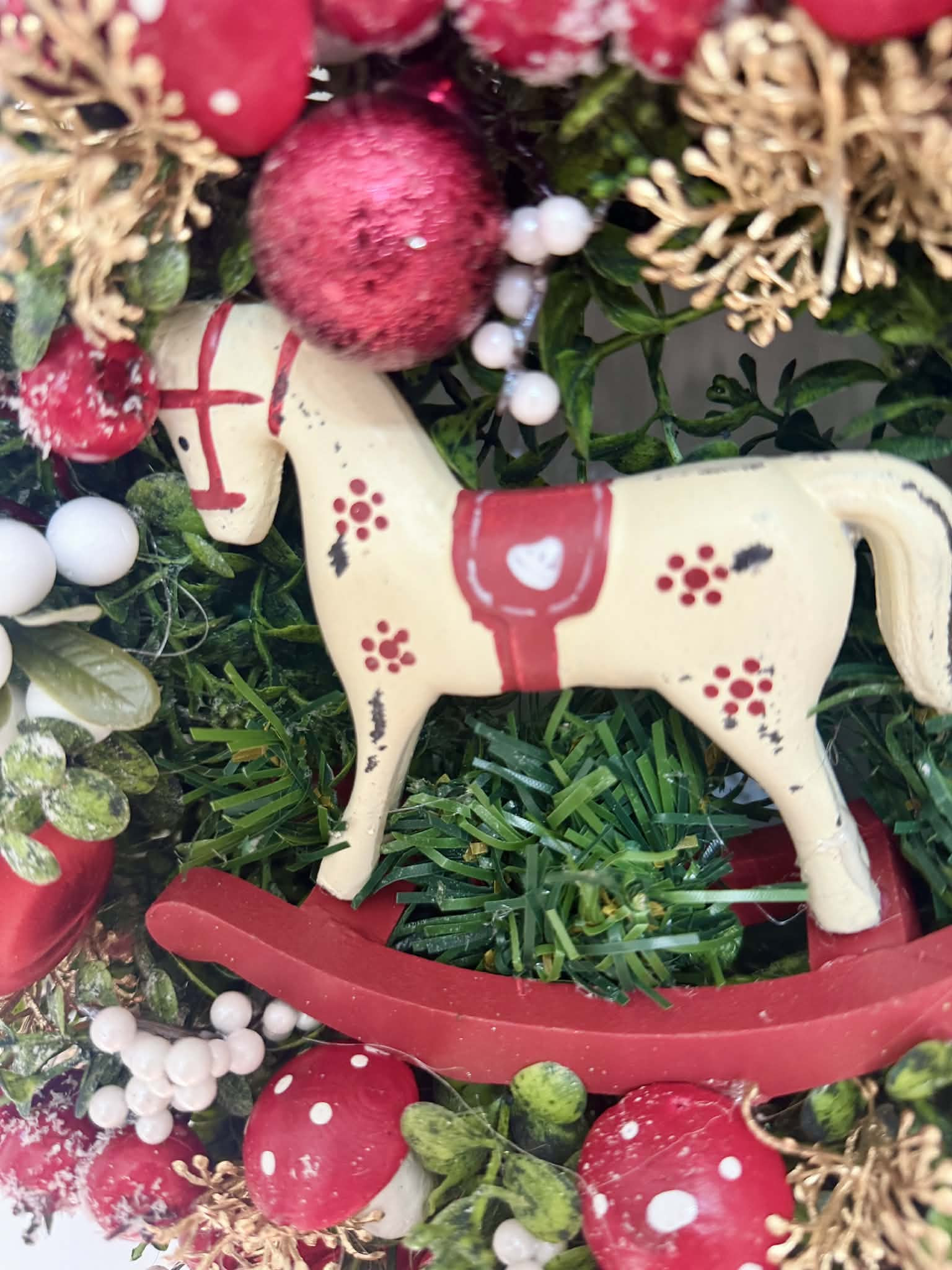Čečinový veniec s bielo červeným zamrznutým zdobením, s červenou mašľou, s dreveným koníkom maslovej farby.