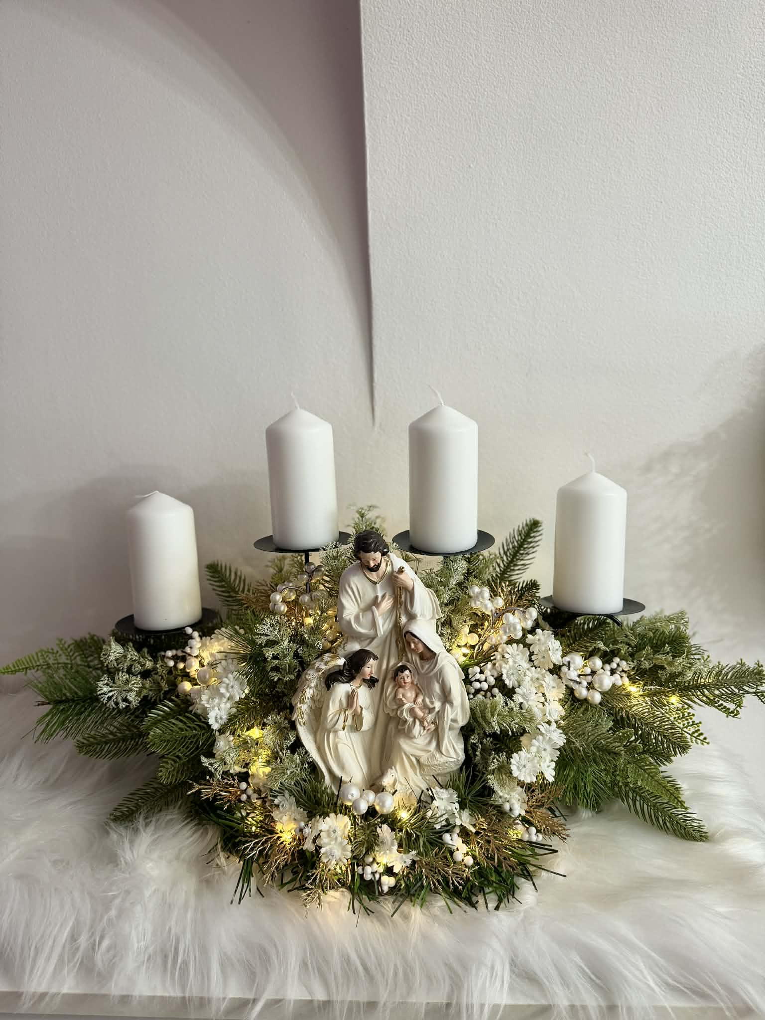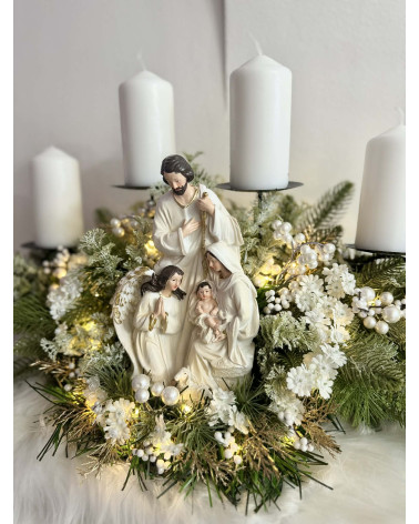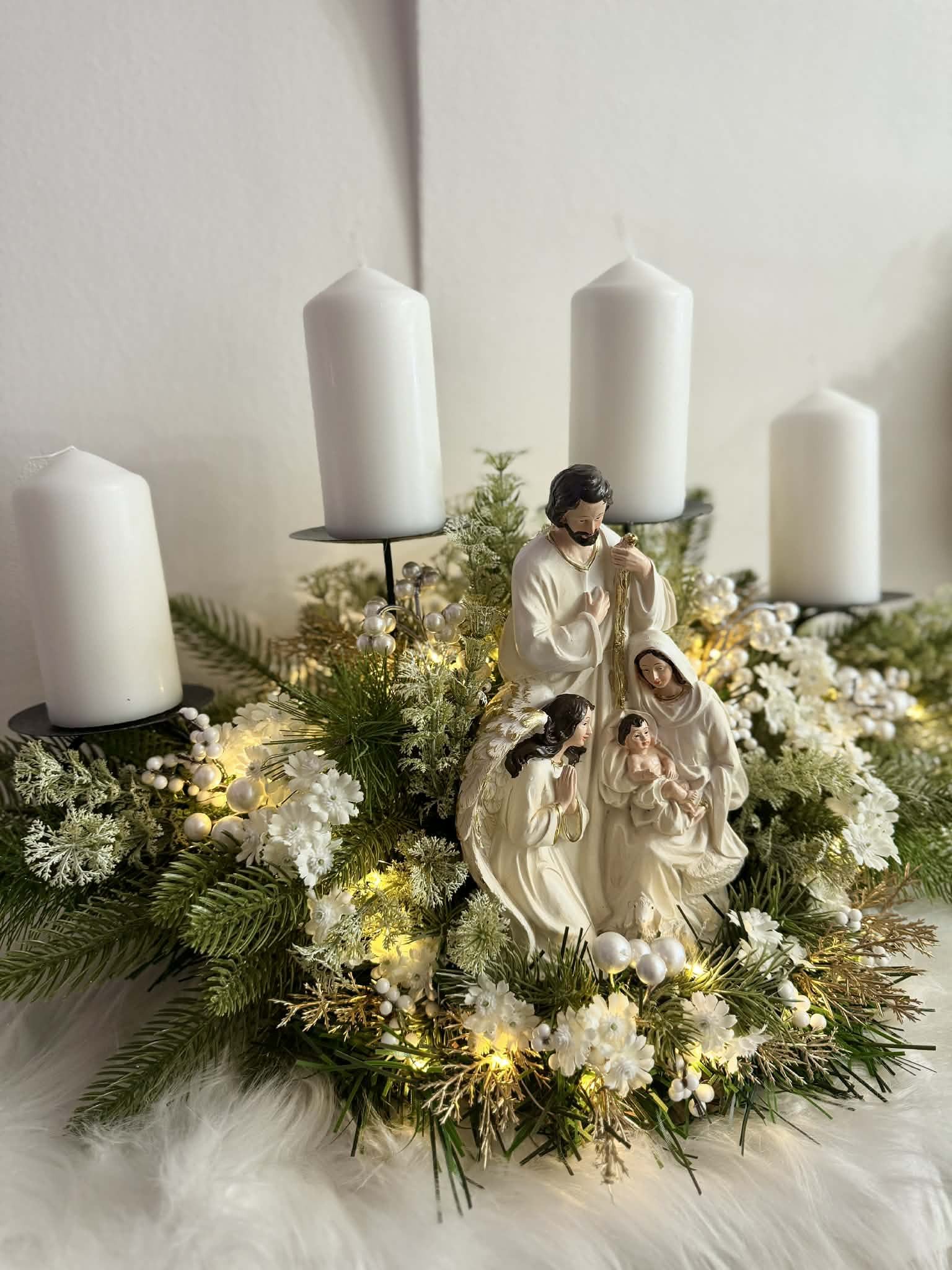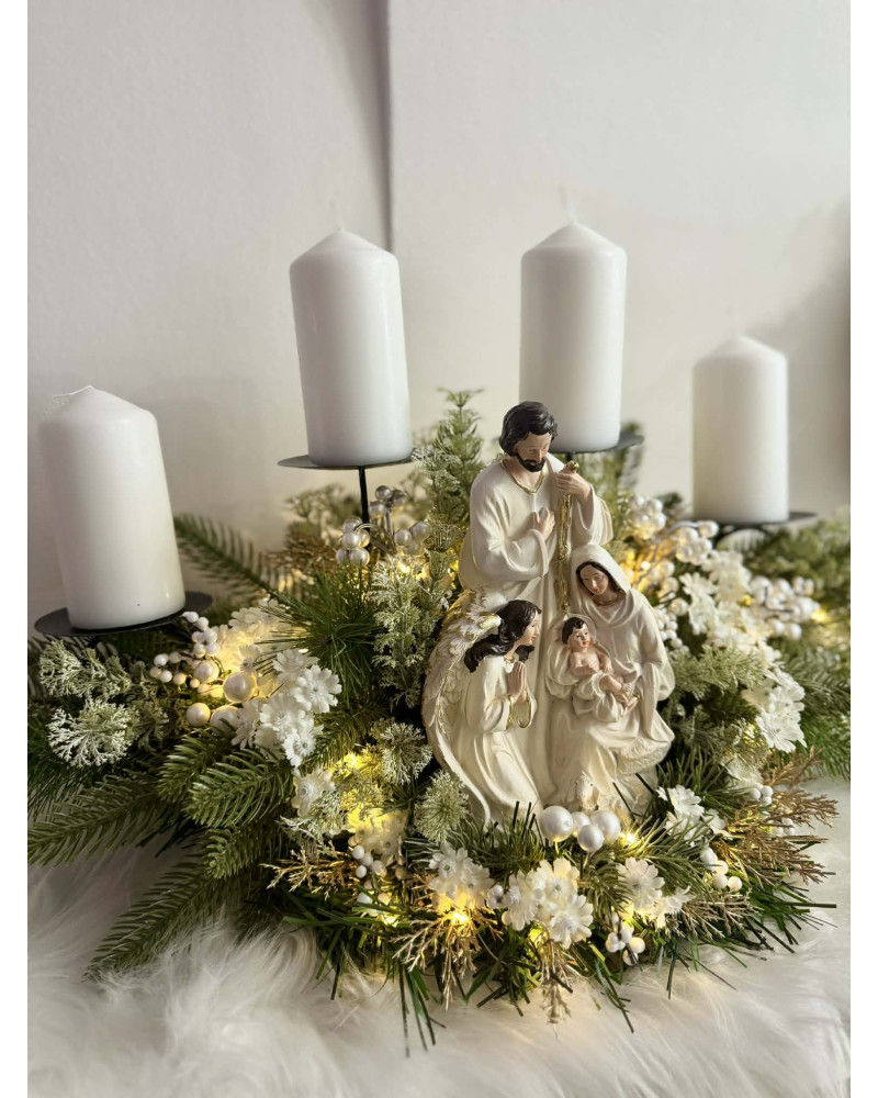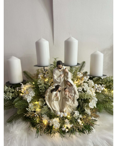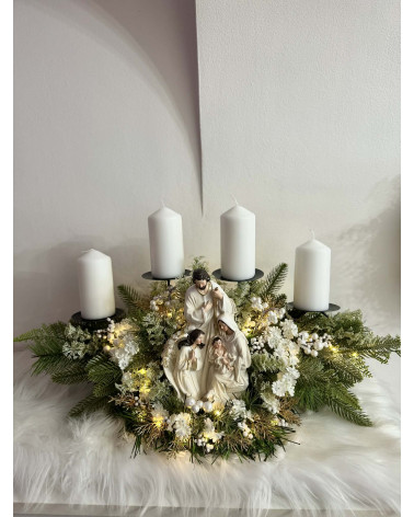Luxusný adventný veniec na drevenej podložke, s kovovou konštrukciou, s bohatým čečinovým zdobením doplneným o rôzne trávy, so Svätou rodinou, s hrubými bielymi sviečkami, ktoré sú na kovových bodcoch. Celá dekorácie je podsvietená svetielkami na baterky, ktoré sú súčasťou dekorácie.