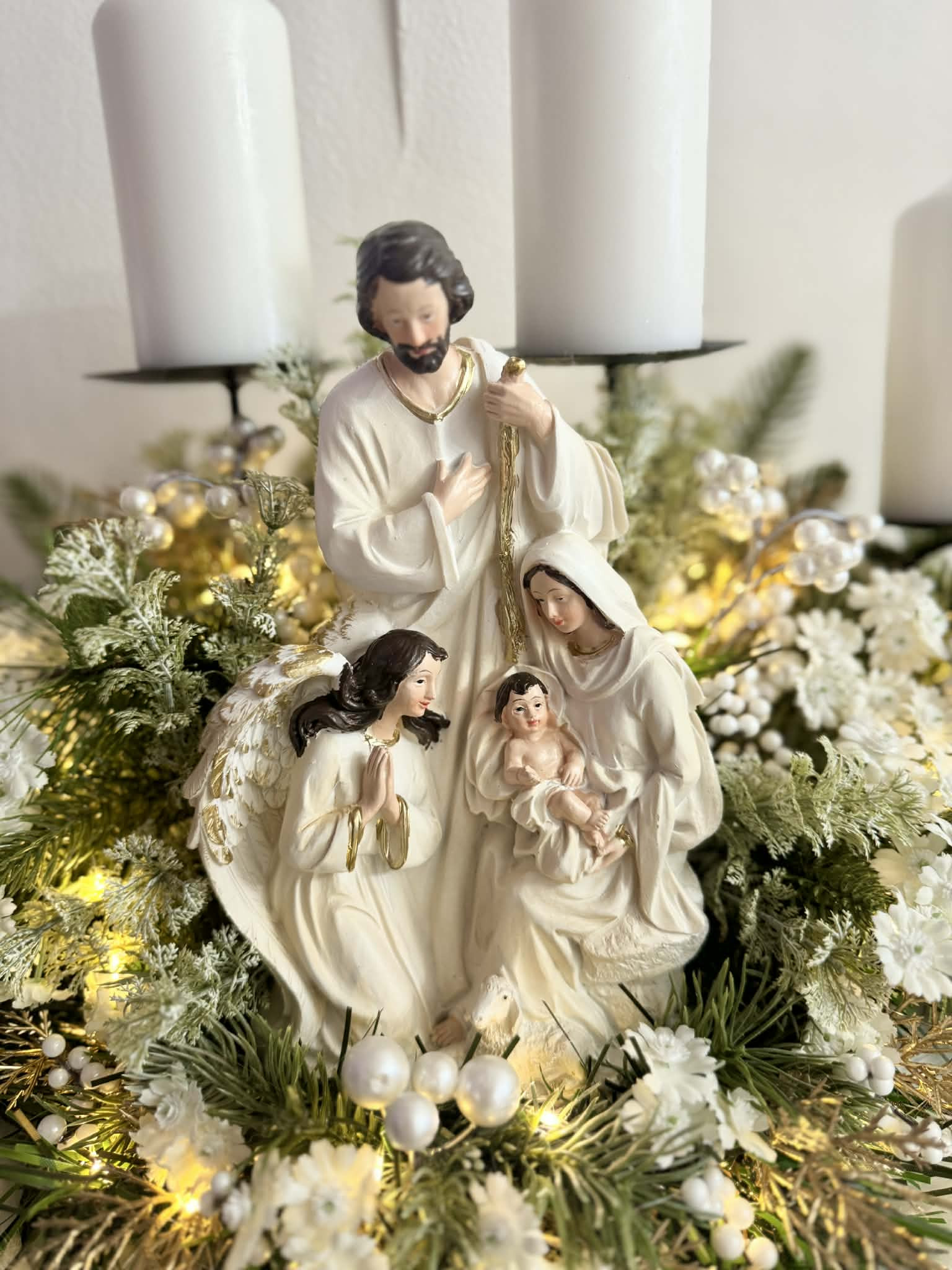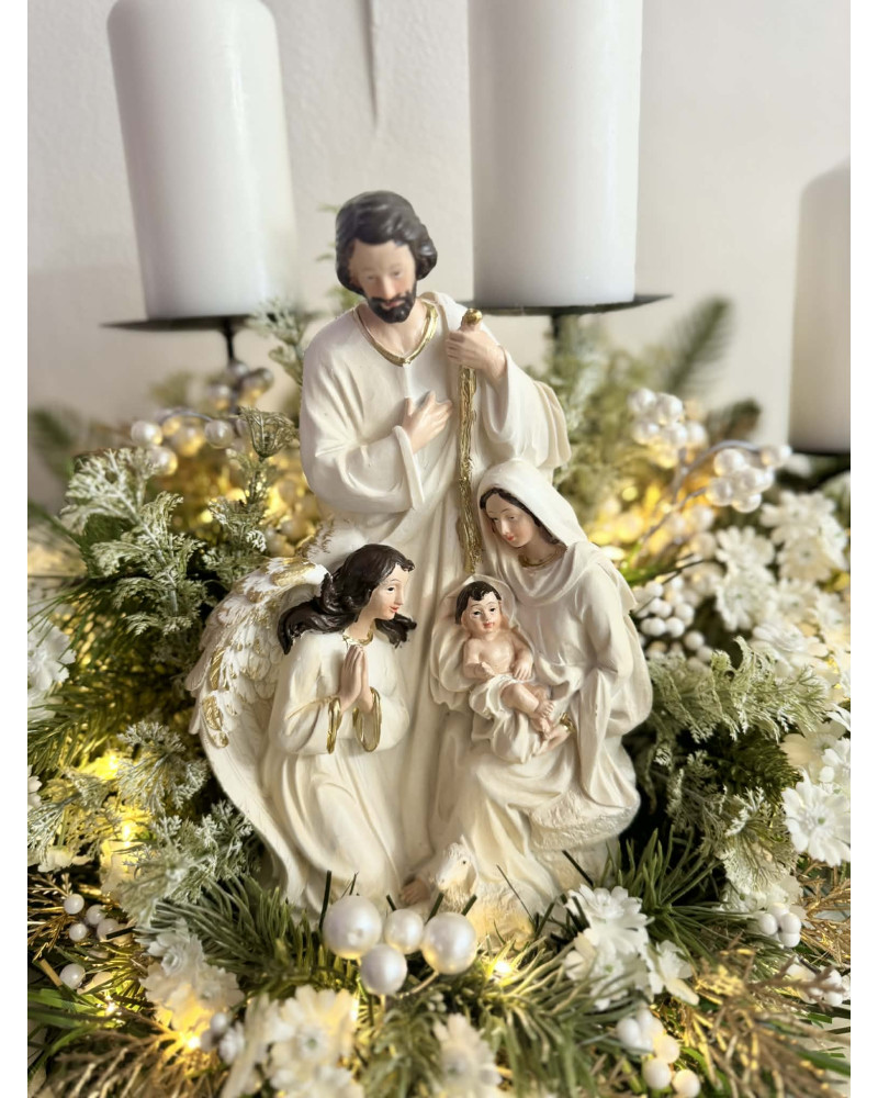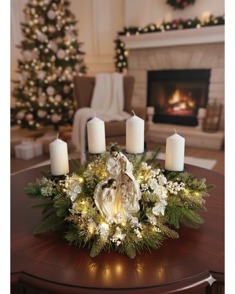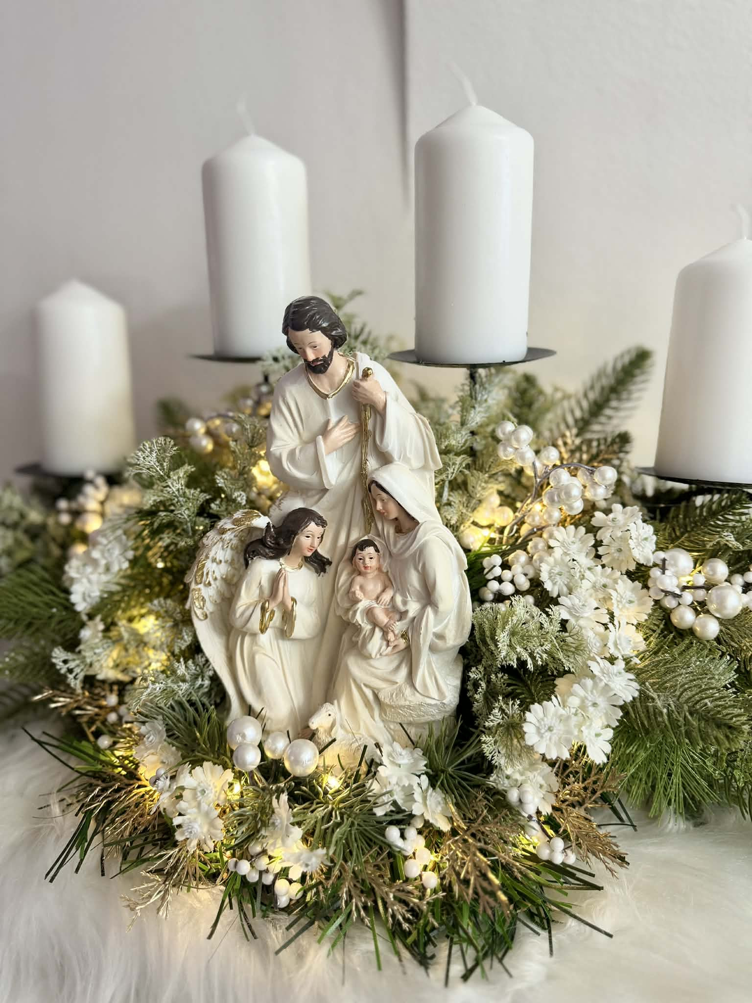 Luxusný adventný veniec na drevenej podložke, s kovovou konštrukciou, s bohatým čečinovým zdobením doplneným o rôzne trávy, so Svätou rodinou, s hrubými bielymi sviečkami, ktoré sú na kovových bodcoch. Celá dekorácie je podsvietená svetielkami na baterky, ktoré sú súčasťou dekorácie.