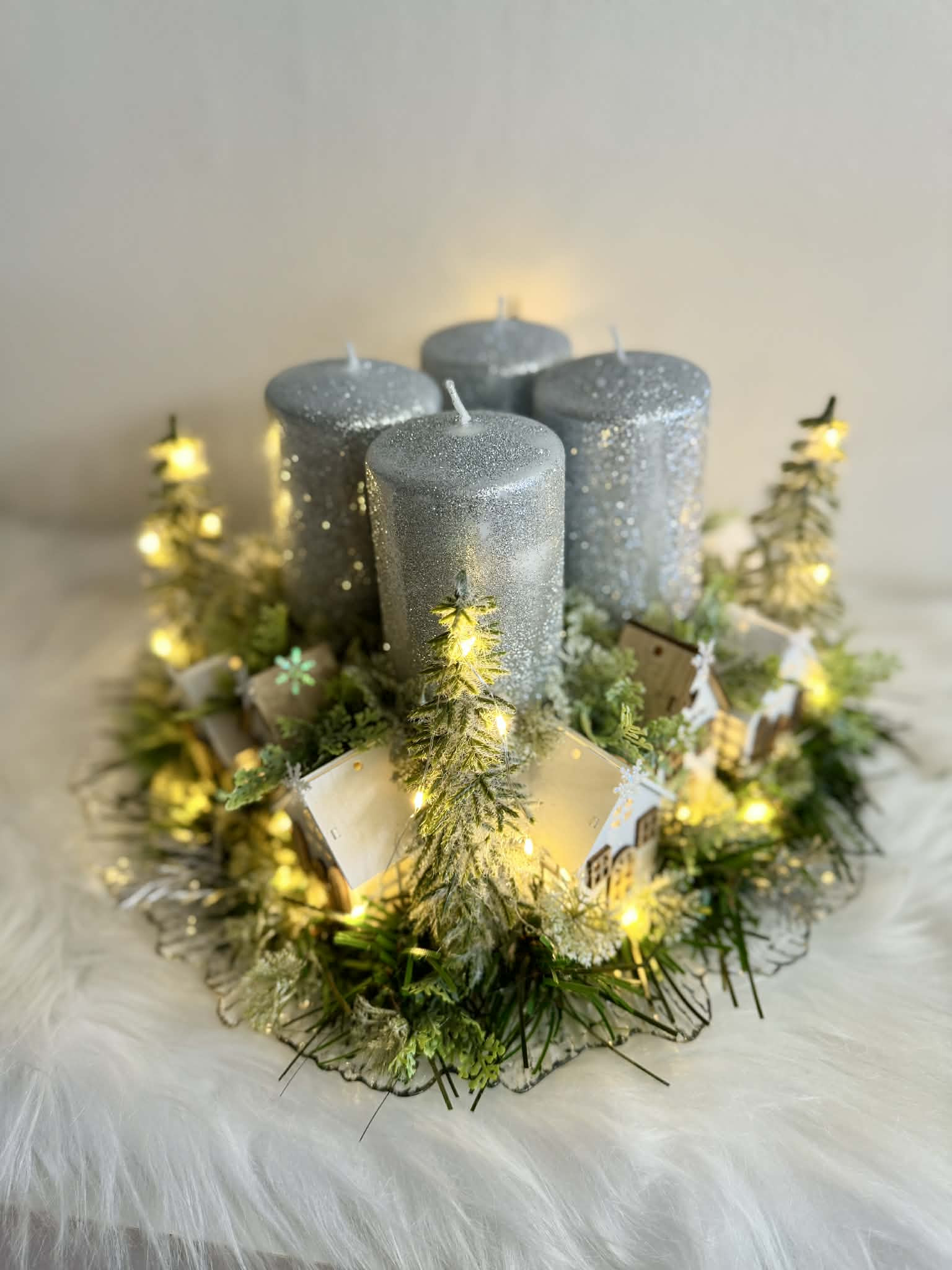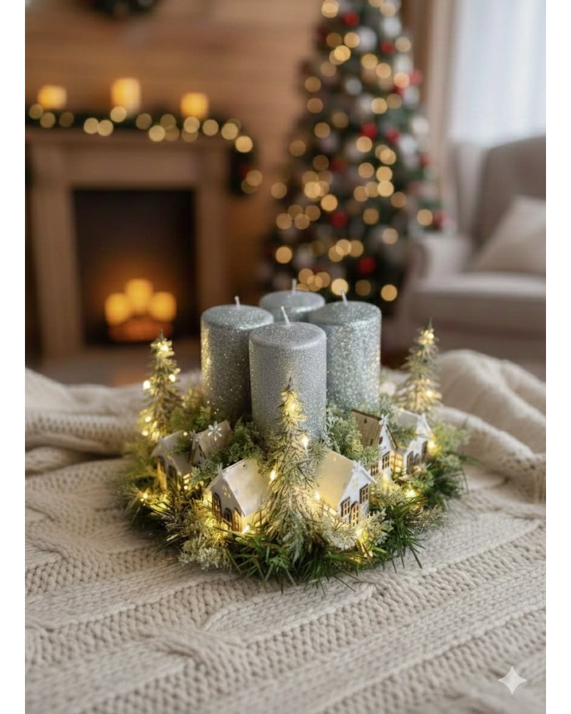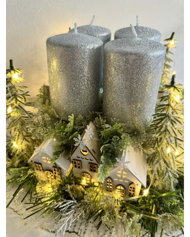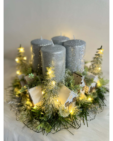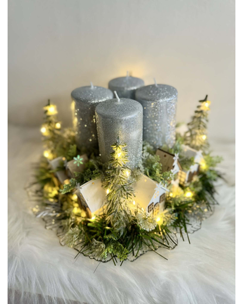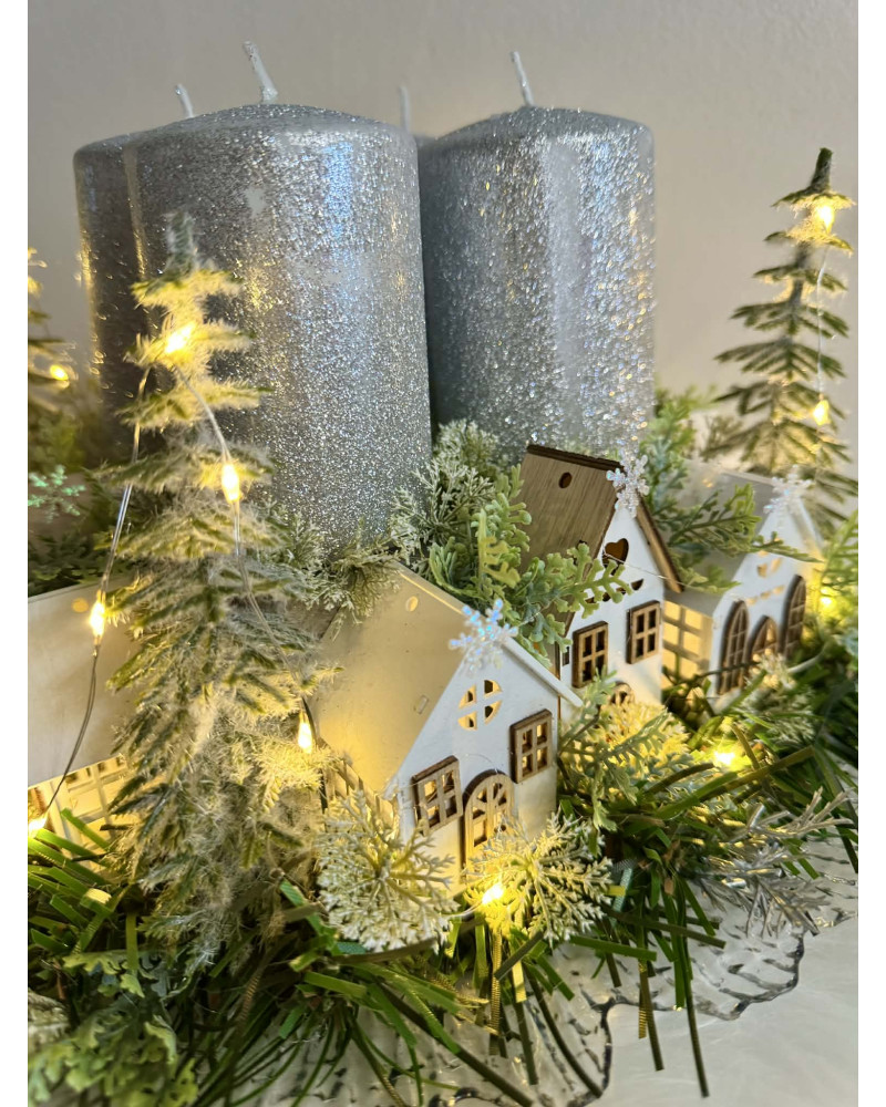 Adventný svietnik robený dookrúhla s drevenými domčekmi, s čečinou, súčasťou svietnika sú ligotavé strieborné sviečky, ktoré sú na bodcoch. Celý svietnik je podsvietený svetielkami na baterky, ktoré sú súčasťou dekorácie.