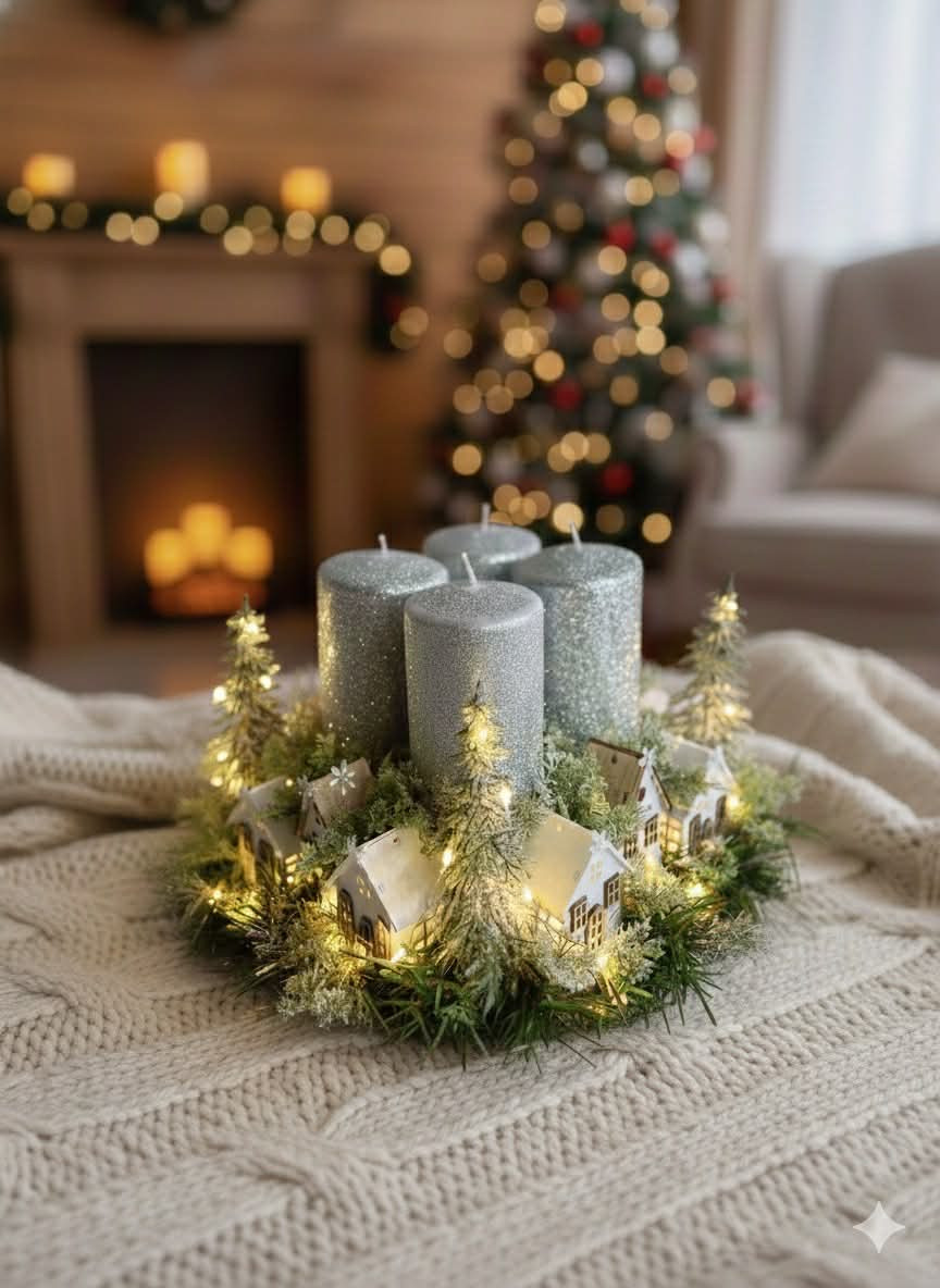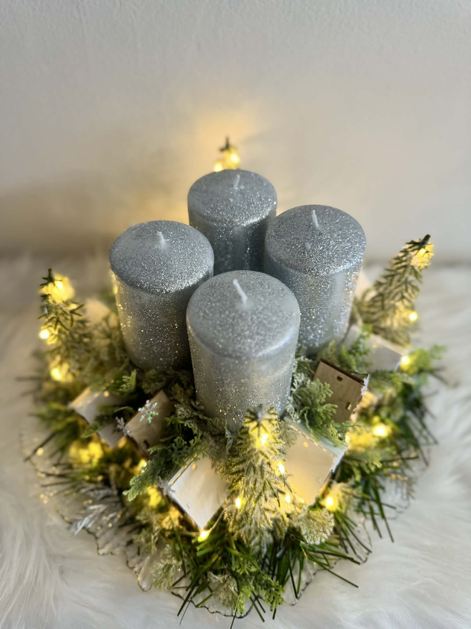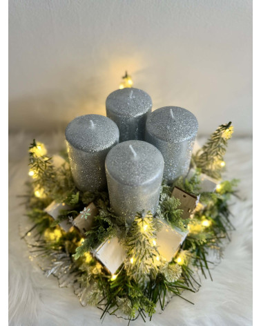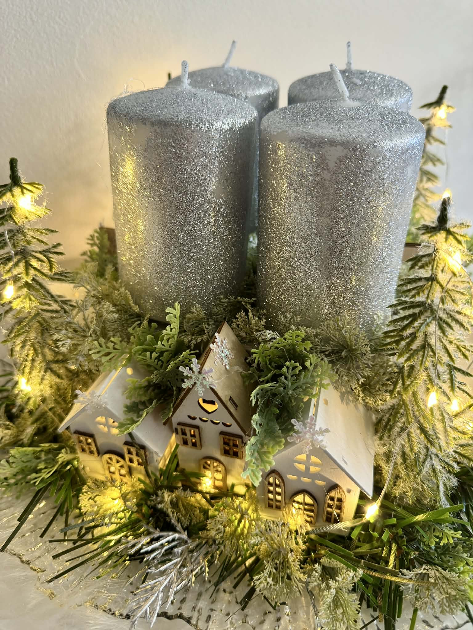 Adventný svietnik robený dookrúhla s drevenými domčekmi, s čečinou, súčasťou svietnika sú ligotavé strieborné sviečky, ktoré sú na bodcoch. Celý svietnik je podsvietený svetielkami na baterky, ktoré sú súčasťou dekorácie.