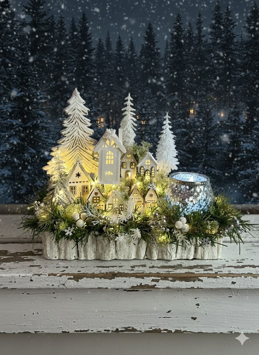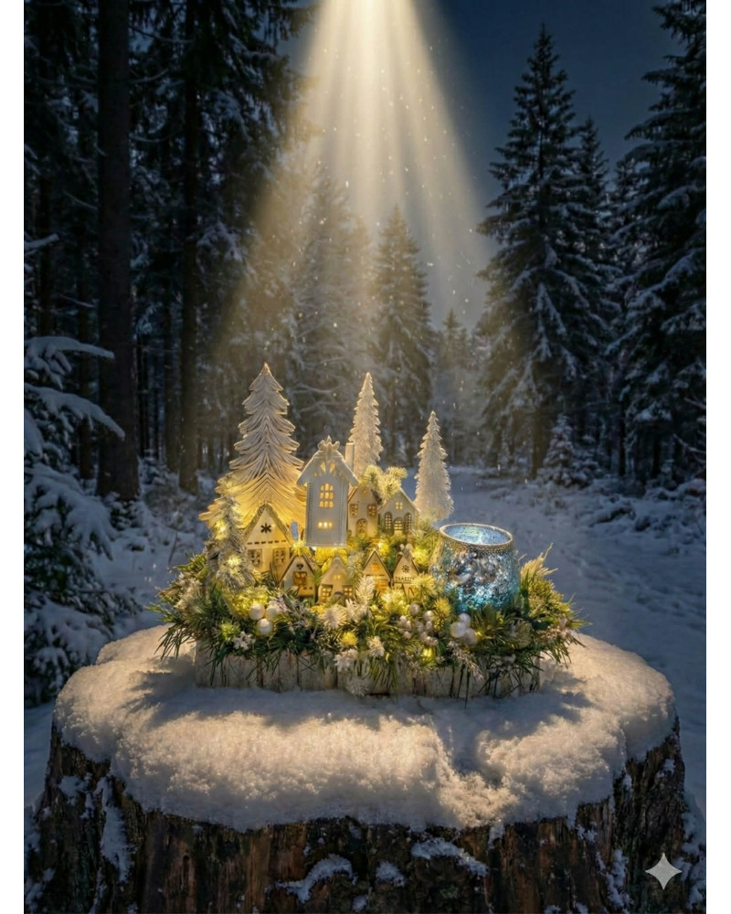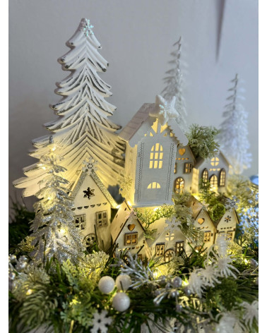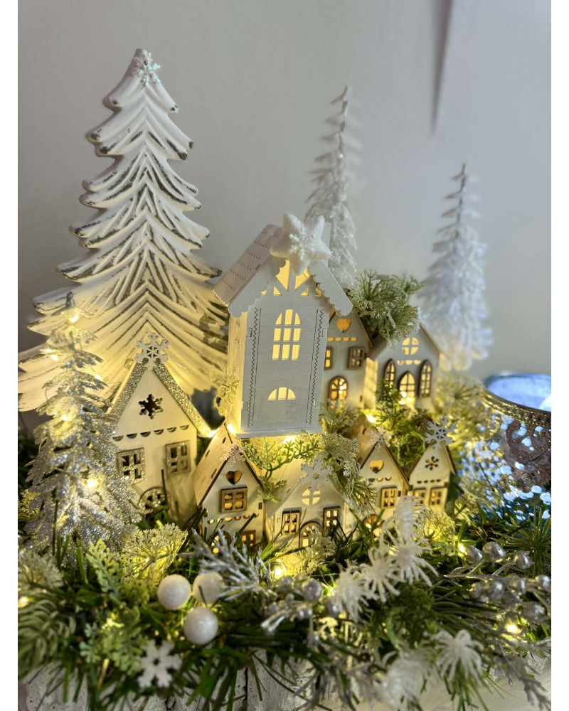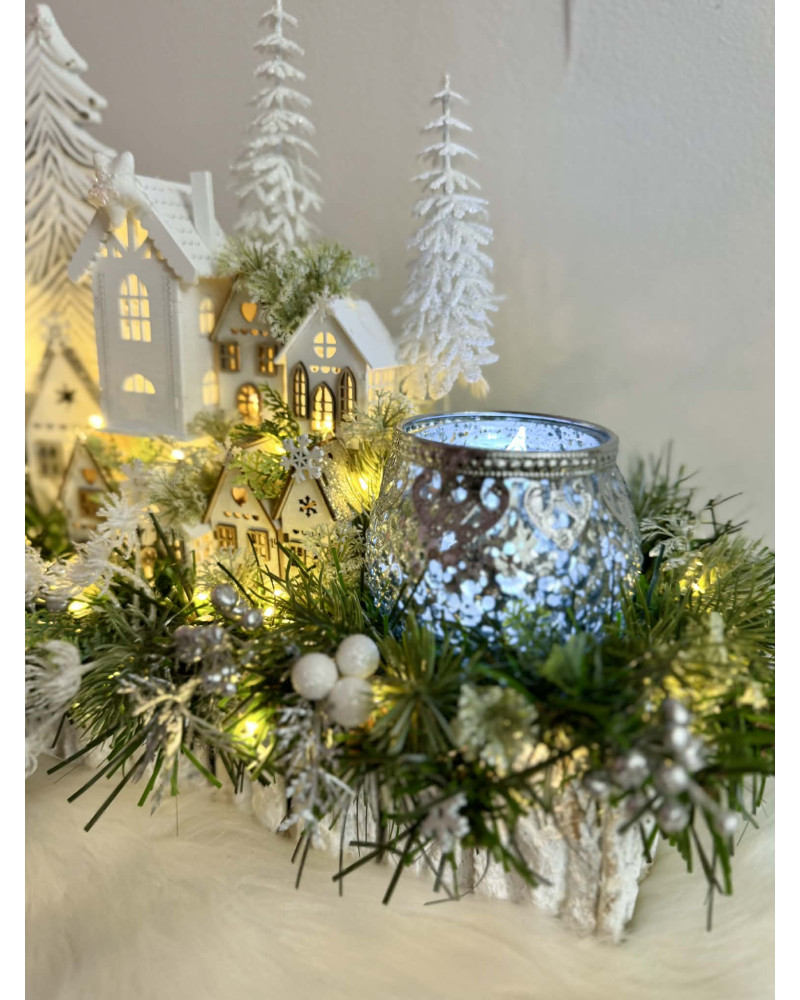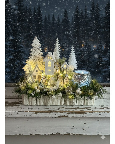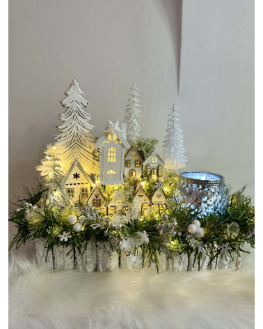 Zimní dedinka robená do obdĺžnikovej nádoby z kôry, dedinka je vystavaná z drevených domčekov, súčasťou je aj drevený strom a strieborný sklenený svietnik na čajový kahanček alebo sviečku s večným svetlom. Celá dekorácia je podsvietená svetielkami na baterky, ktoré sú súčasťou dekorácie.