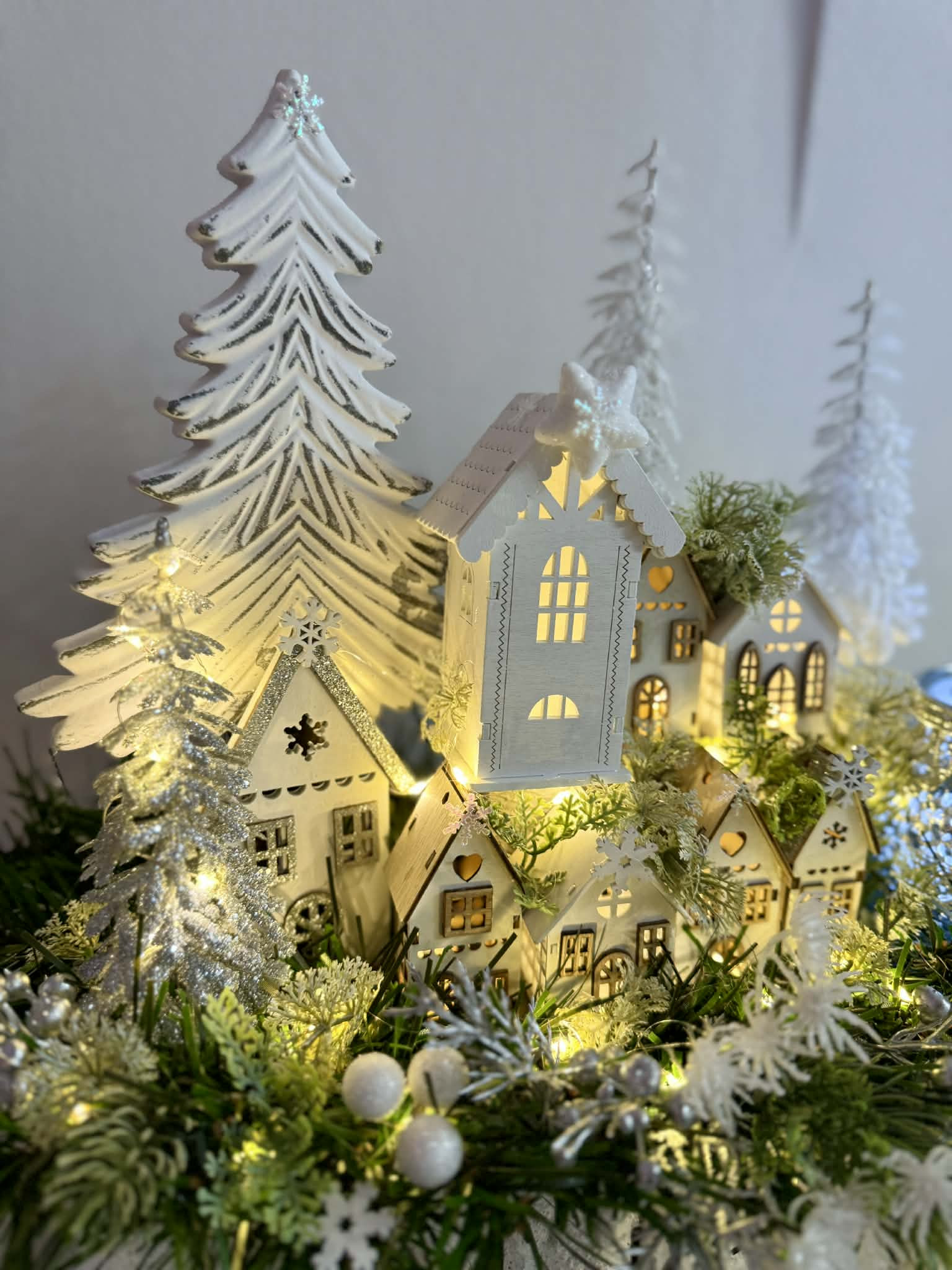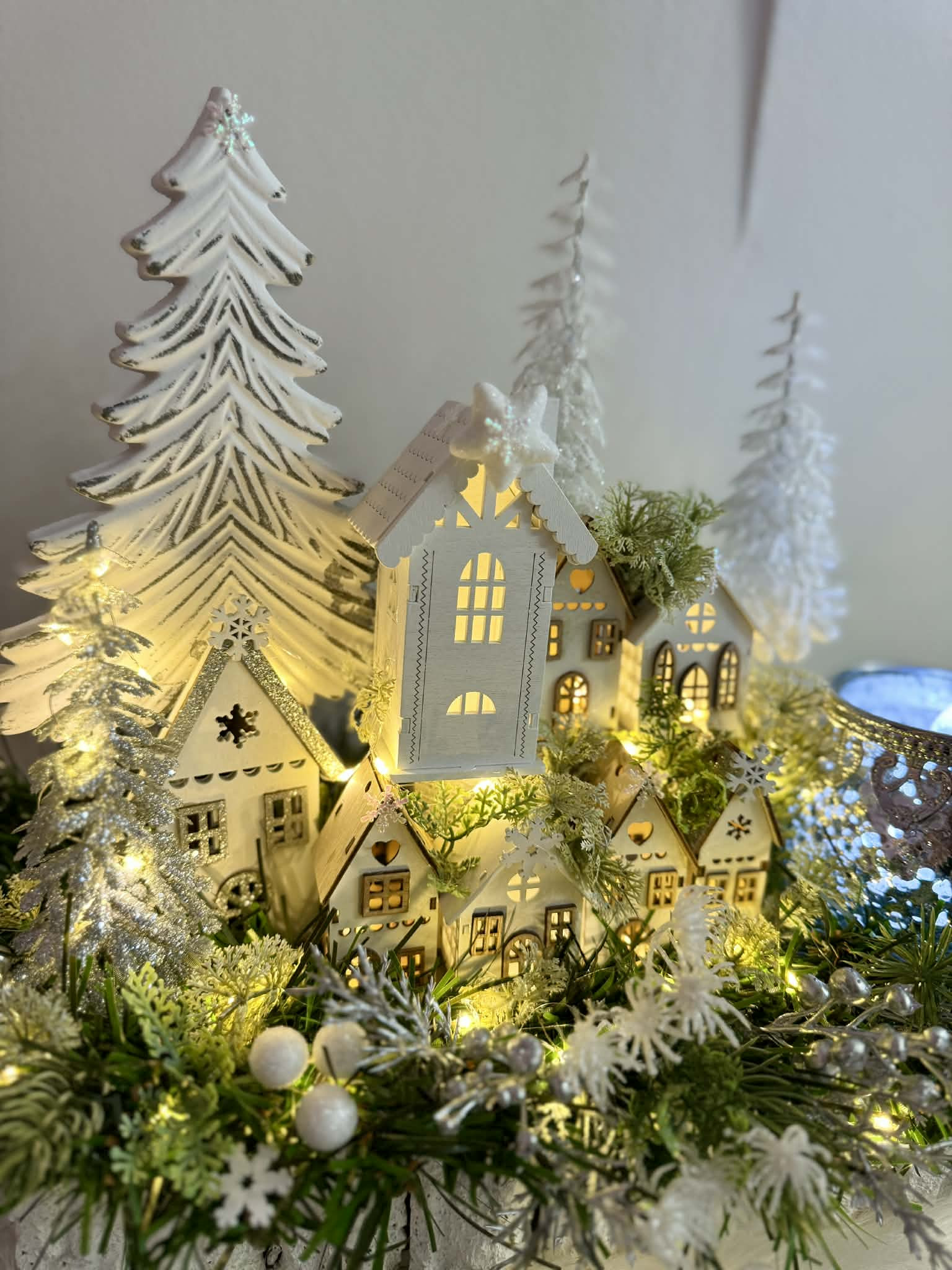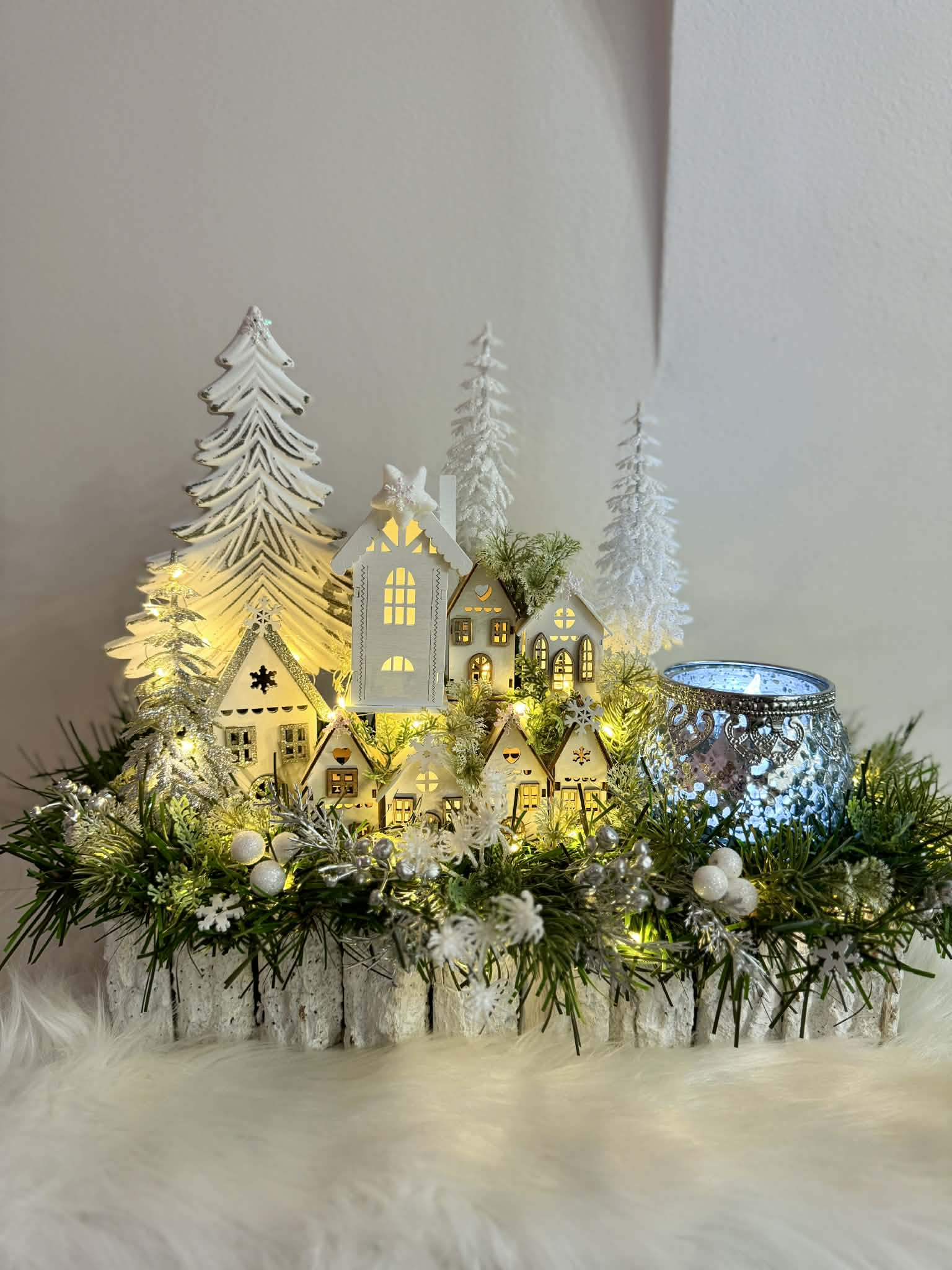 Zimní dedinka robená do obdĺžnikovej nádoby z kôry, dedinka je vystavaná z drevených domčekov, súčasťou je aj drevený strom a strieborný sklenený svietnik na čajový kahanček alebo sviečku s večným svetlom. Celá dekorácia je podsvietená svetielkami na baterky, ktoré sú súčasťou dekorácie.