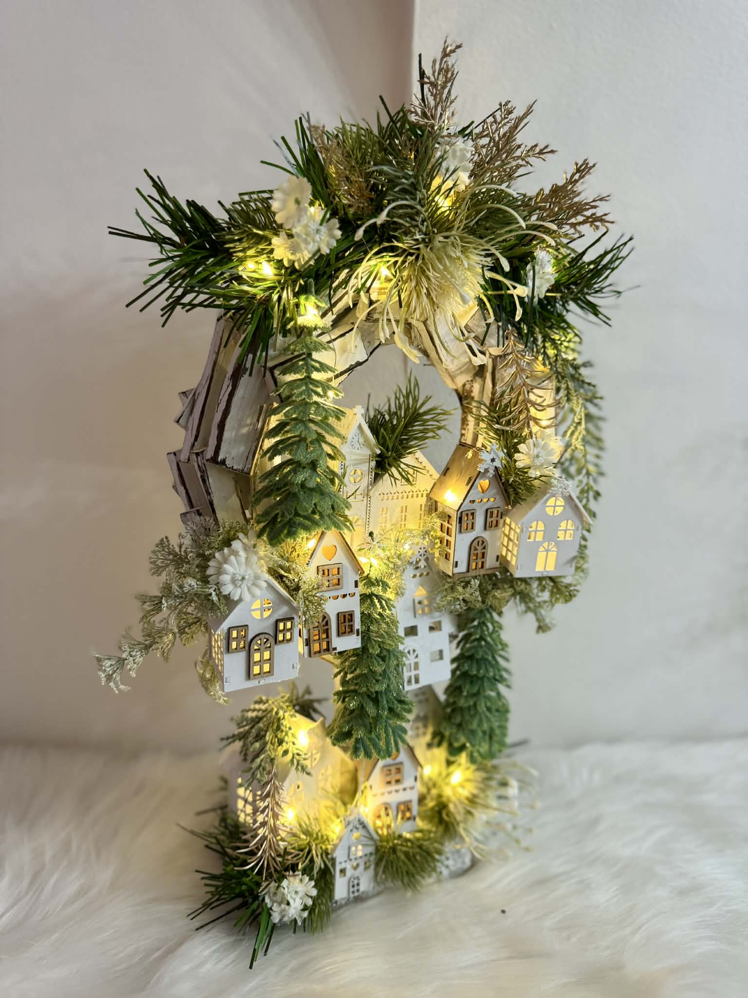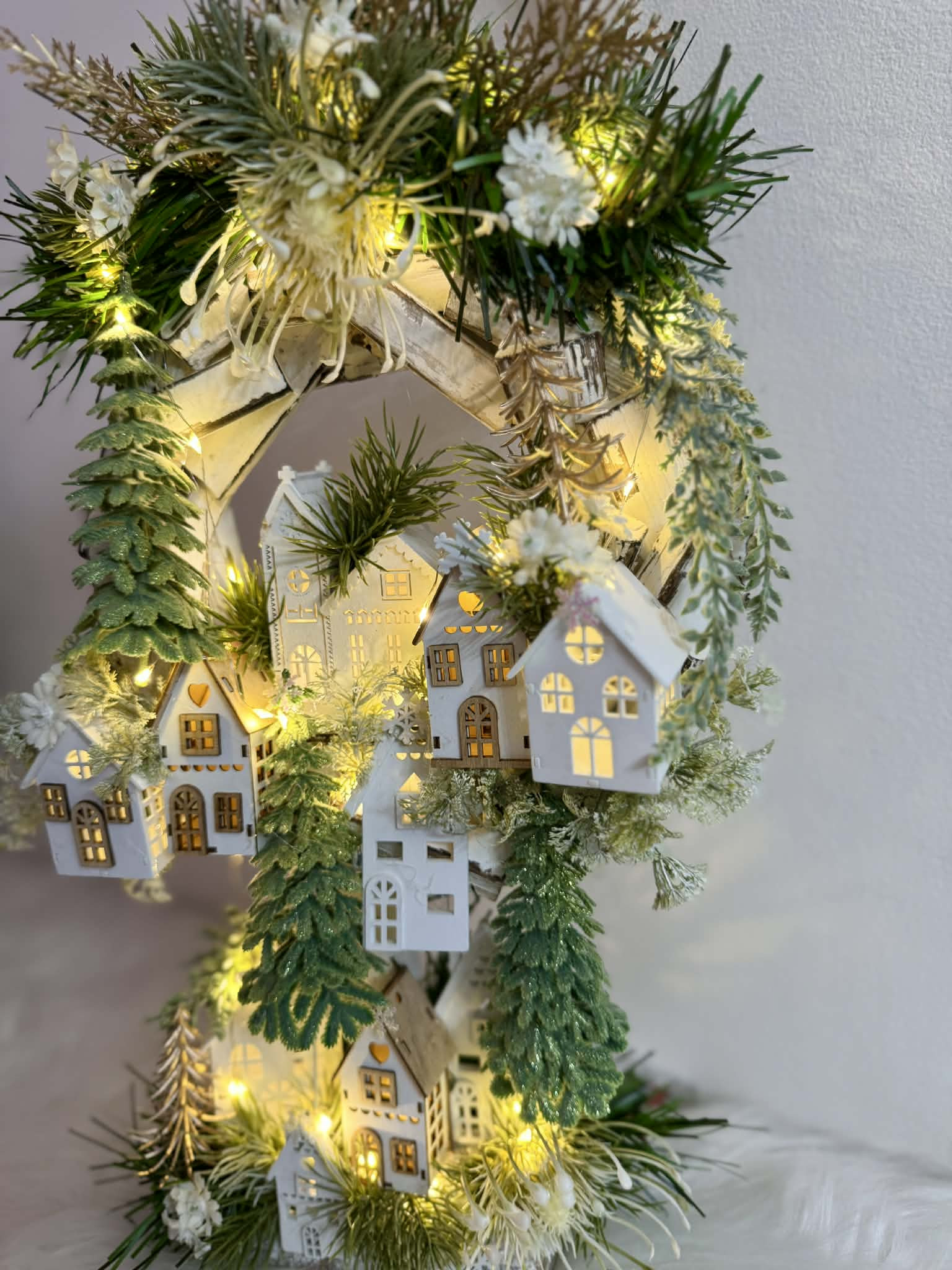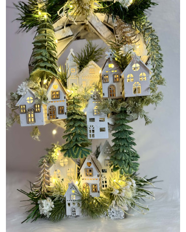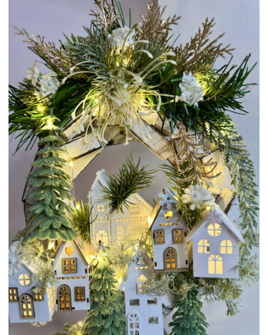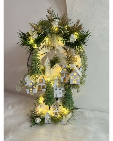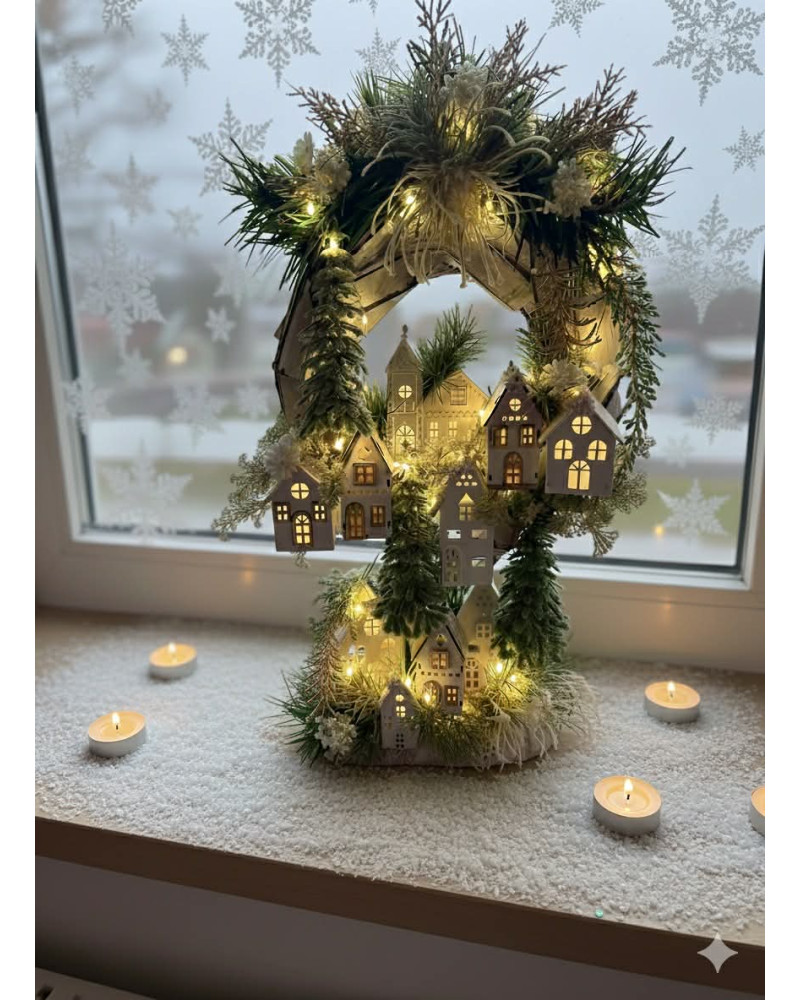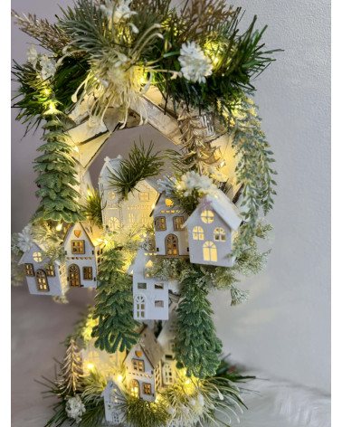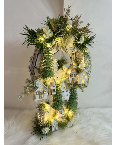 Drvený stojatý veniec dozdobený s drevenými domčekmi a zeleňou. Celá dekorácia je podsvietená svetielkami na baterky, ktoré sú súčasťou dekorácia. Svojou výškou je vhodná na parapetu, do okna či na komódu.
