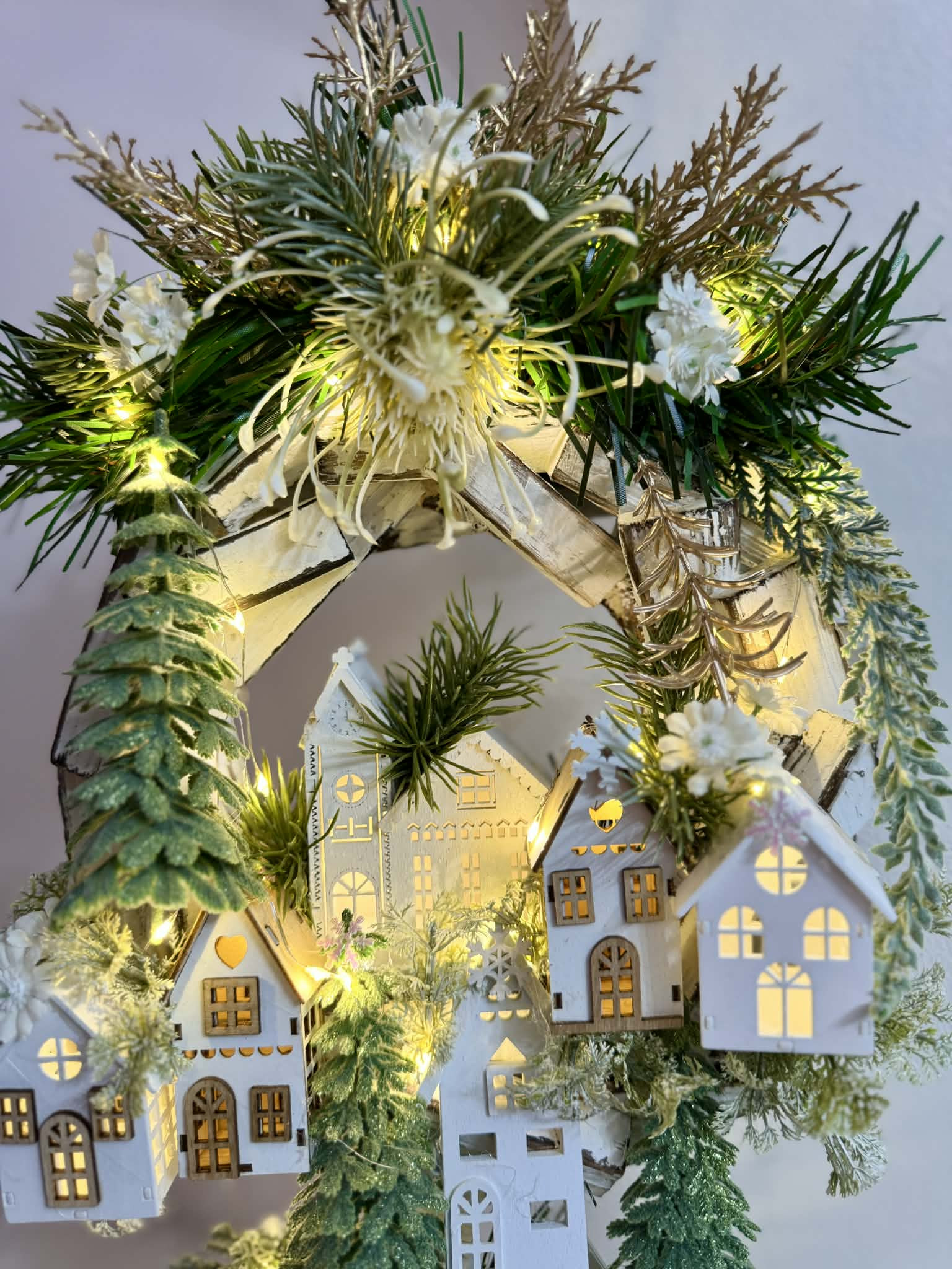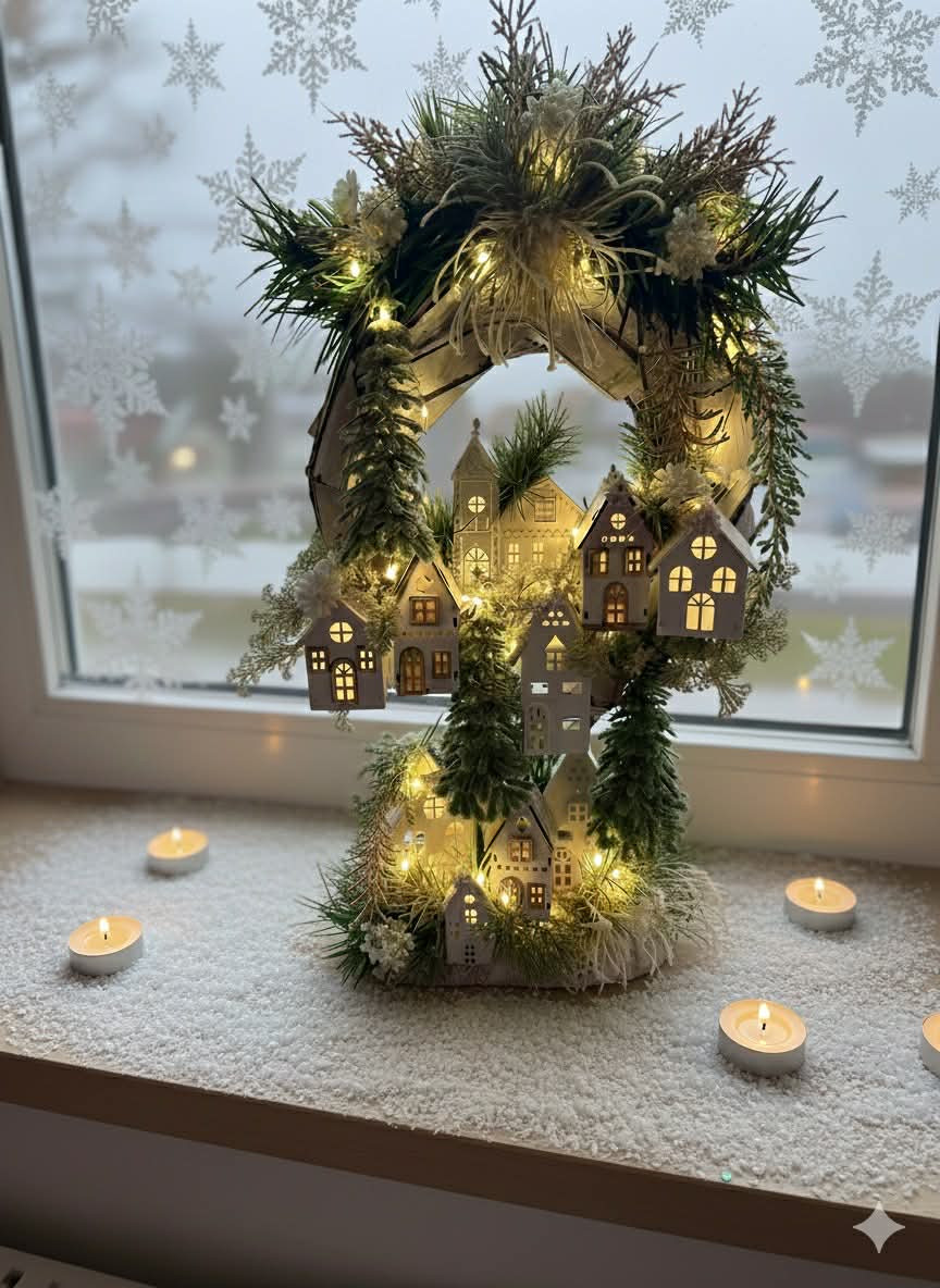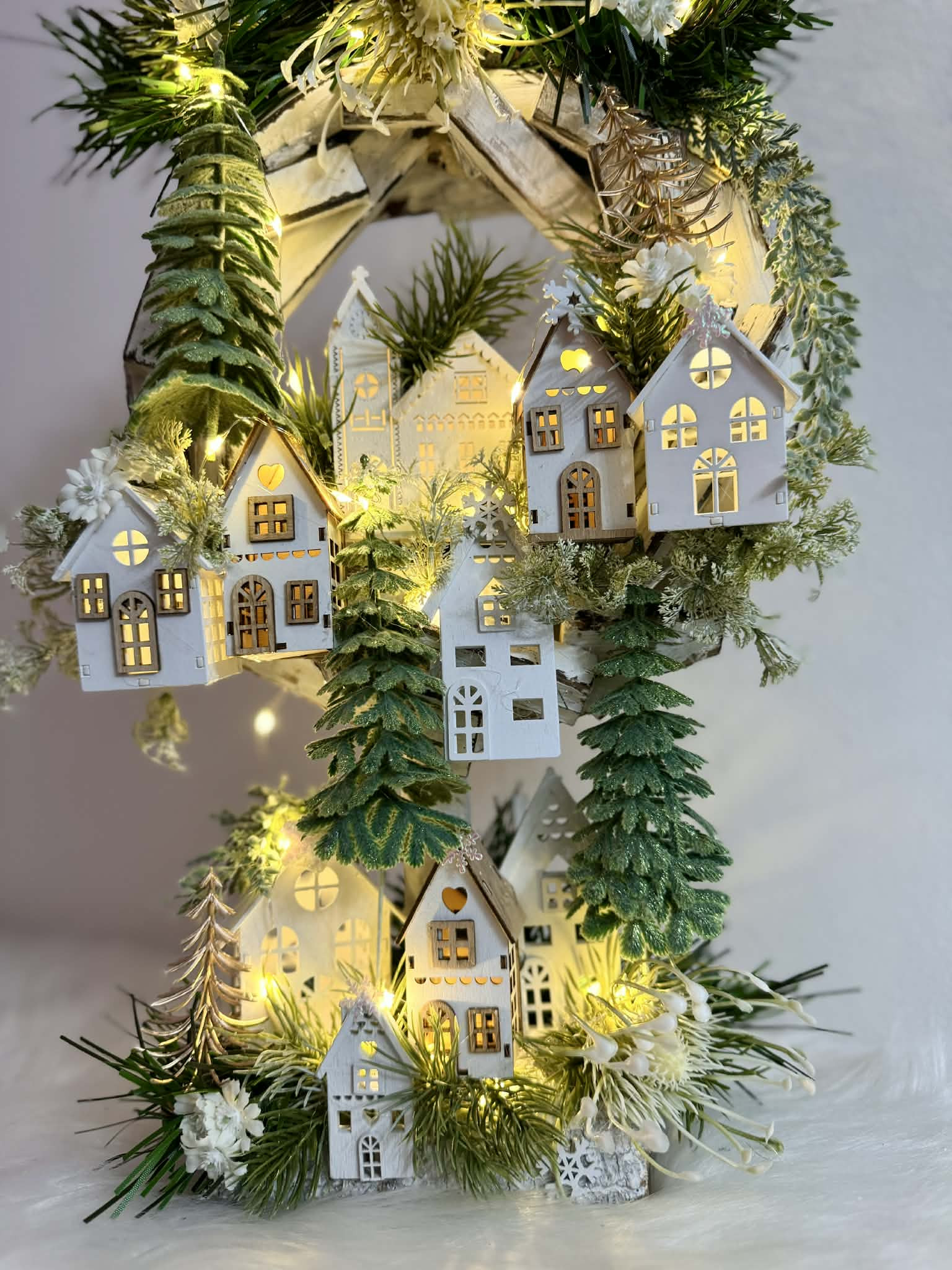 Drvený stojatý veniec dozdobený s drevenými domčekmi a zeleňou. Celá dekorácia je podsvietená svetielkami na baterky, ktoré sú súčasťou dekorácia. Svojou výškou je vhodná na parapetu, do okna či na komódu.