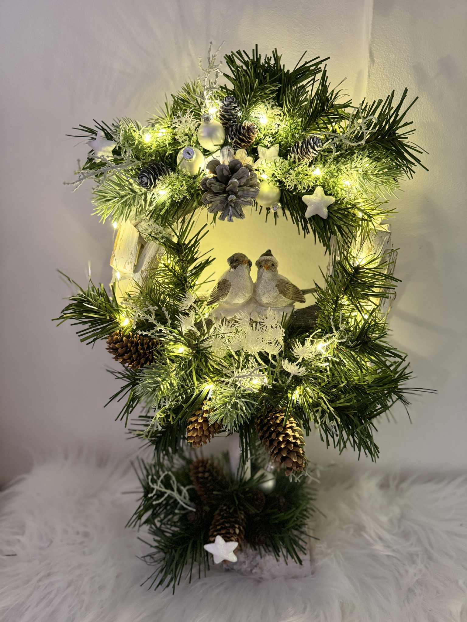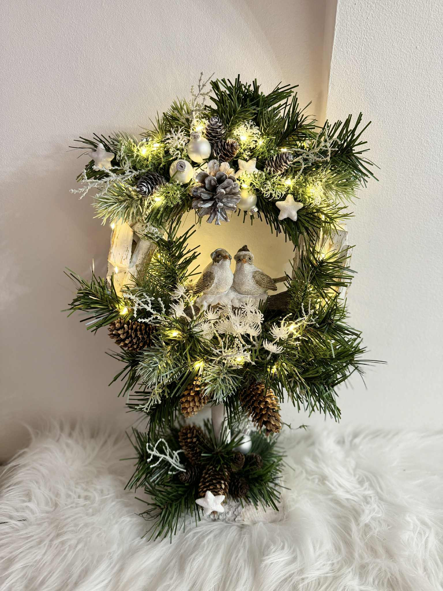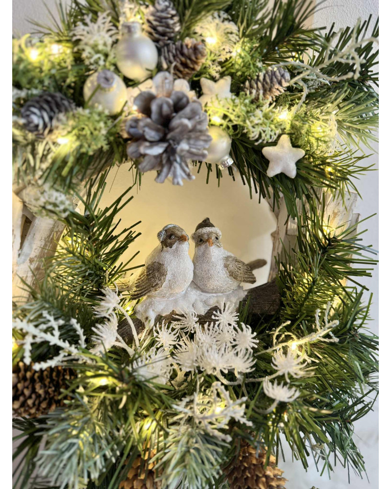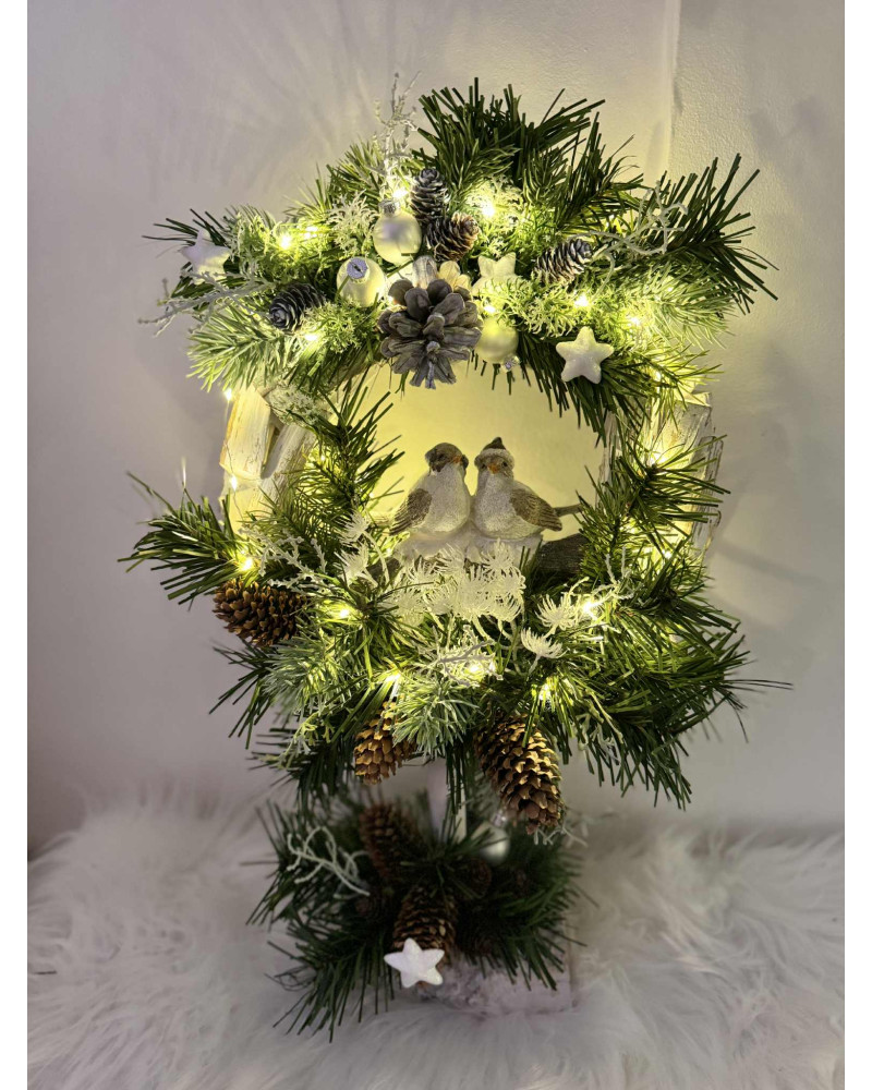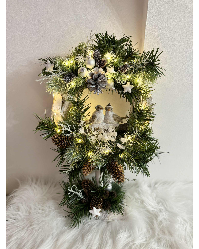 Drevený stojatý veniec s keramickými vtáčikmi dozdobené čečinou, šiškami a rôznymi zimnými doplnkami, veniec je podsvietený svetielkami na baterky, ktoré sú súčasťou dekorácie.
