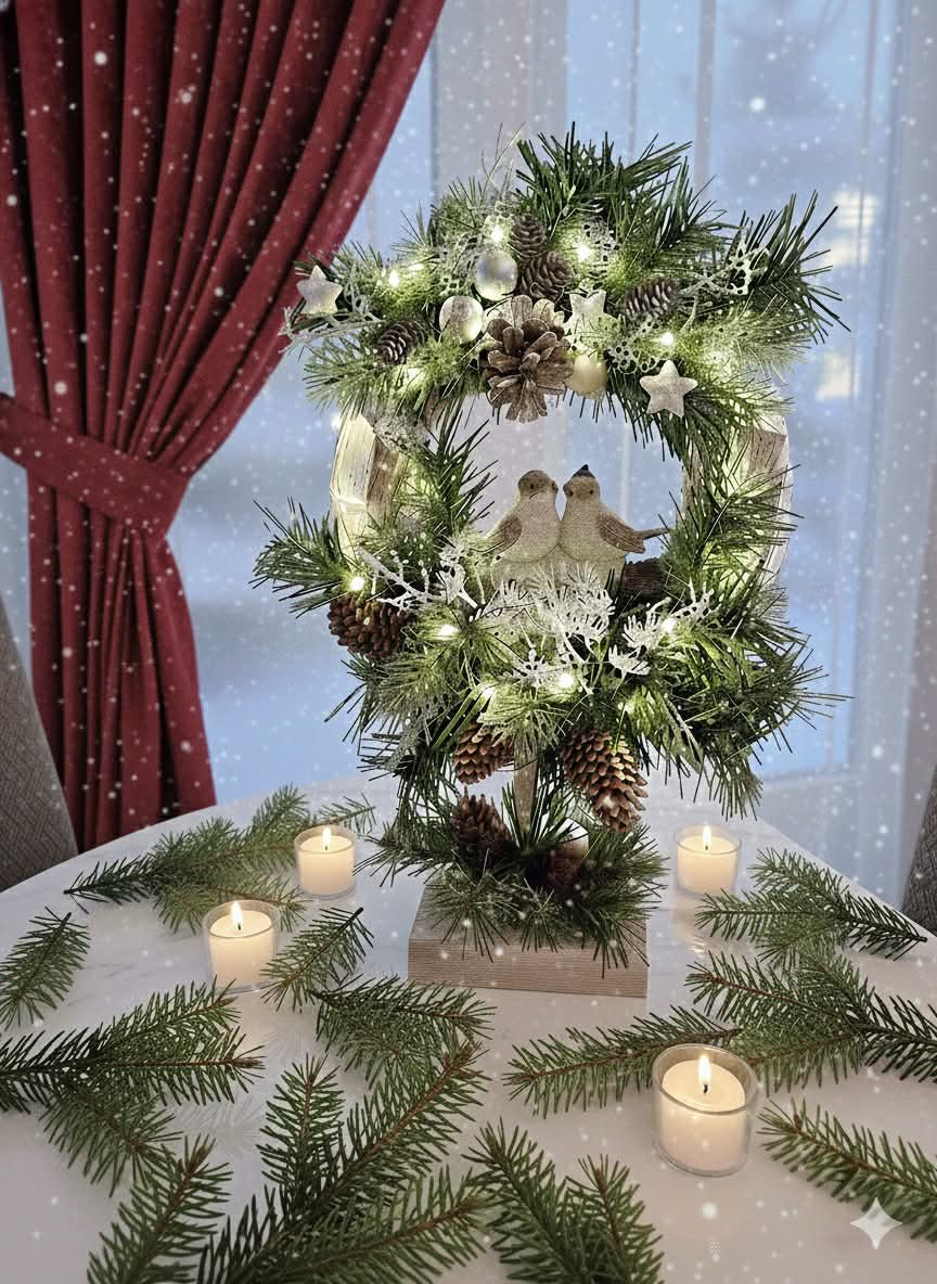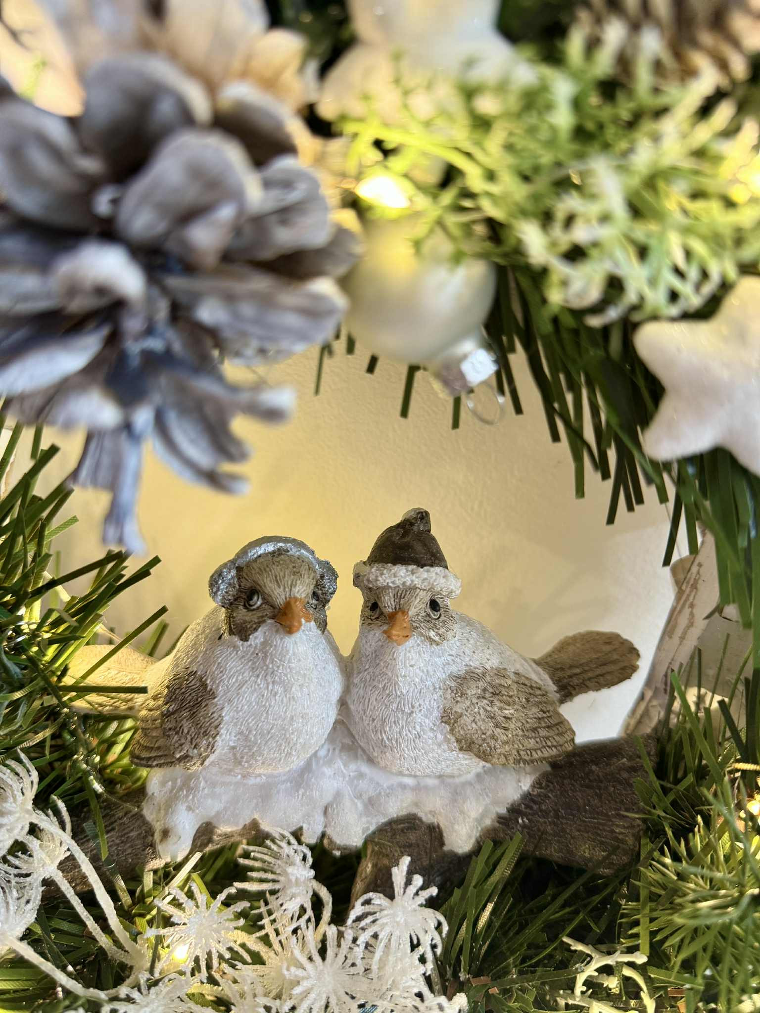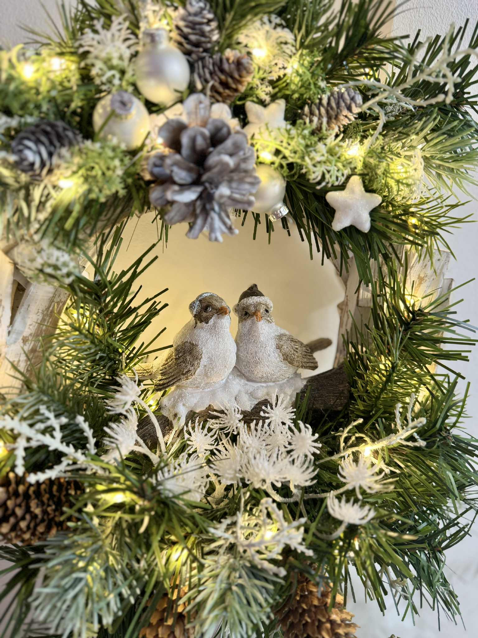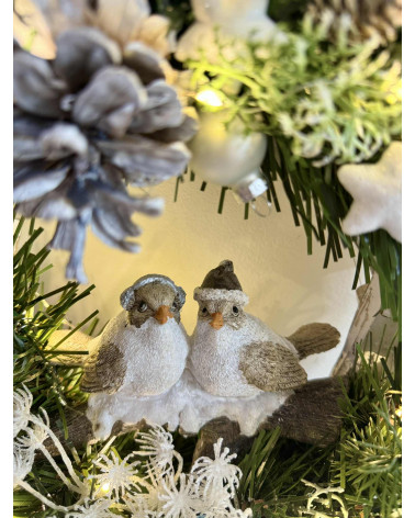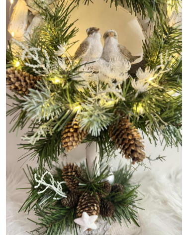 Drevený stojatý veniec s keramickými vtáčikmi dozdobené čečinou, šiškami a rôznymi zimnými doplnkami, veniec je podsvietený svetielkami na baterky, ktoré sú súčasťou dekorácie.