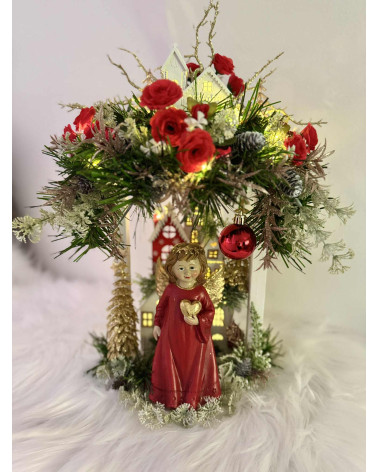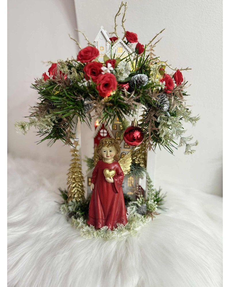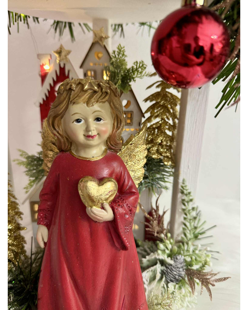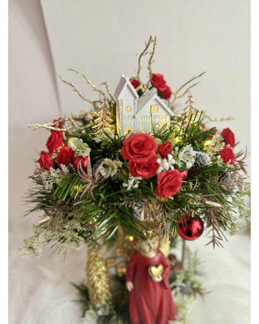 Drevený stojan s červeno zlatým anjelom, ktorý si drží sviečku. Je bohato zdobený, aj podsvietený svetielkami na baterky, ktoré sú súčasťou dekorácie.