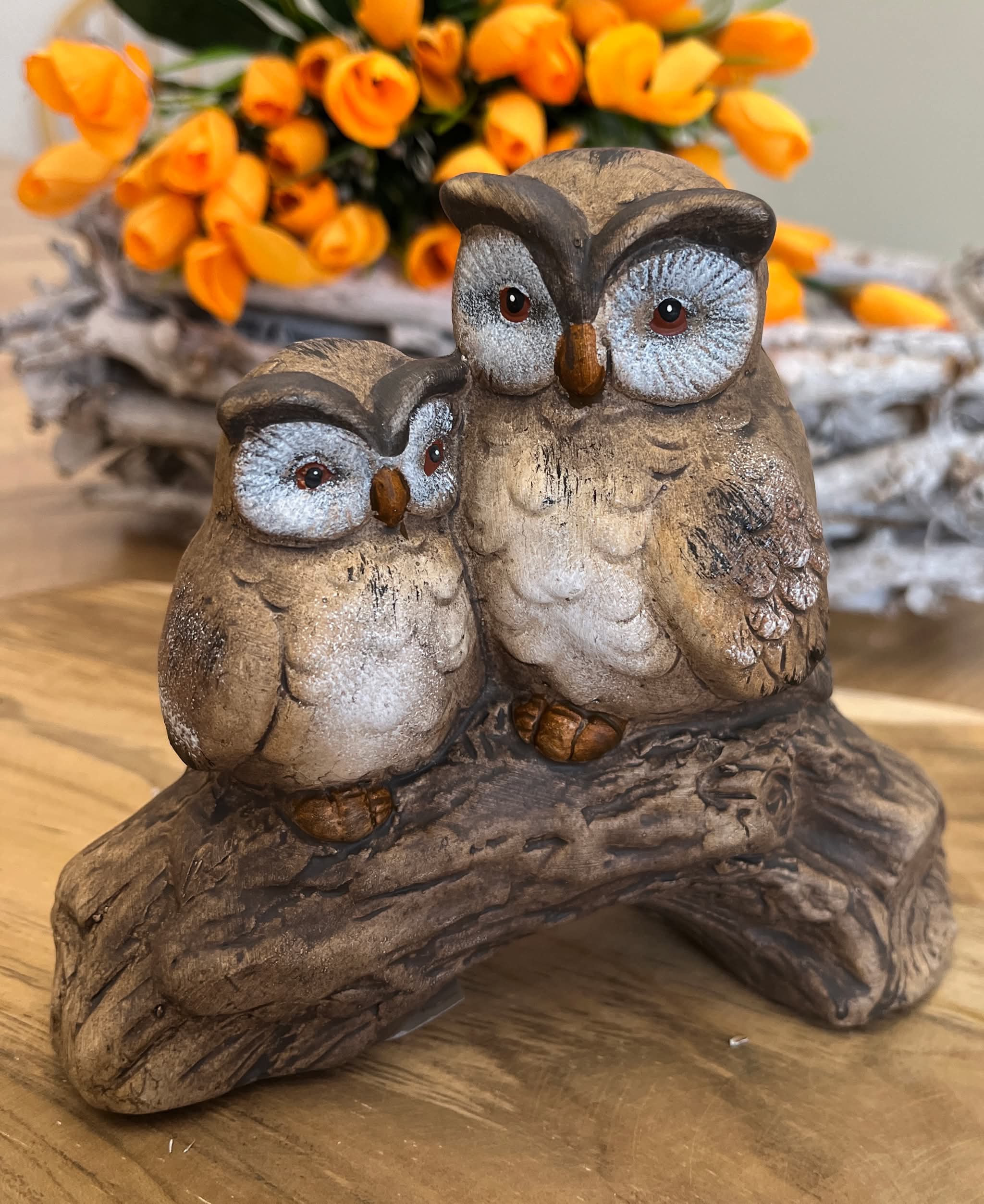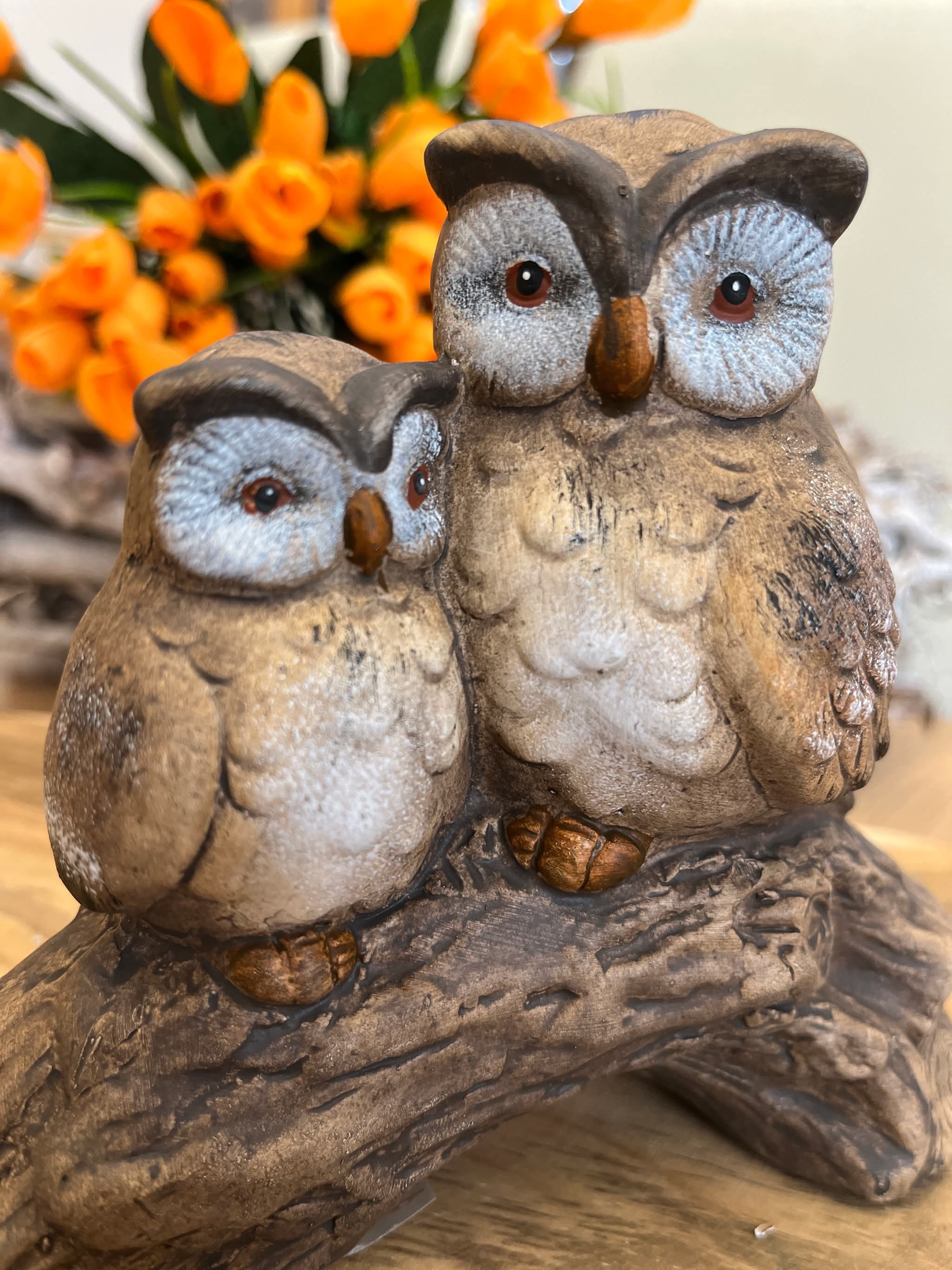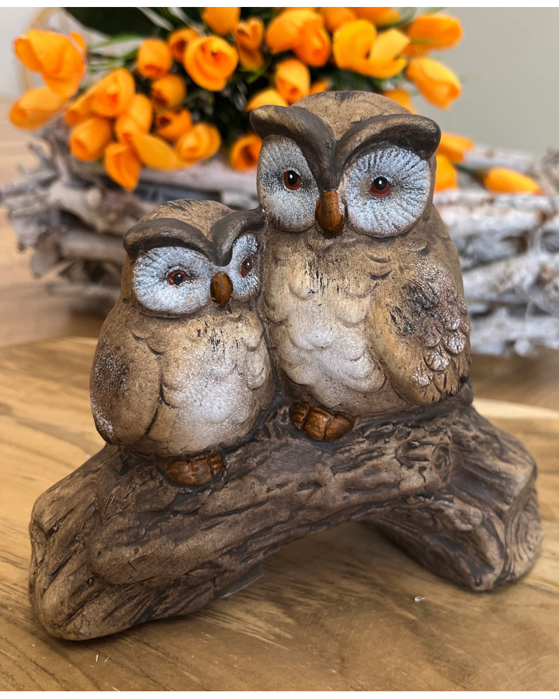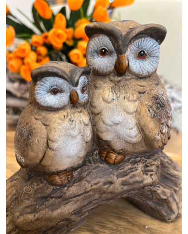 Dve hnedé sediace sovy na konári.